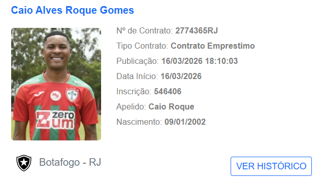 Caio Roque assinou contrato de empréstimo, cedido pela Portuguesa, até dezembro de 2026, com opção de compra. O Glorioso ainda vai pagar uma compensação financeira imediata à Lusa, segundo informou o clube paulista.