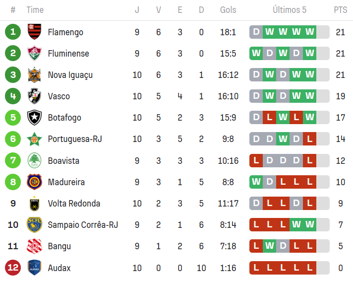 O Vasco, que venceu o Volta Redonda neste sábado no Espírito Santo por 2 a 1, tem 19 pontos, enquanto o Botafogo – que derrotou o lanterna Audax por 2 a 0 no Nilton Santos – tem 17.