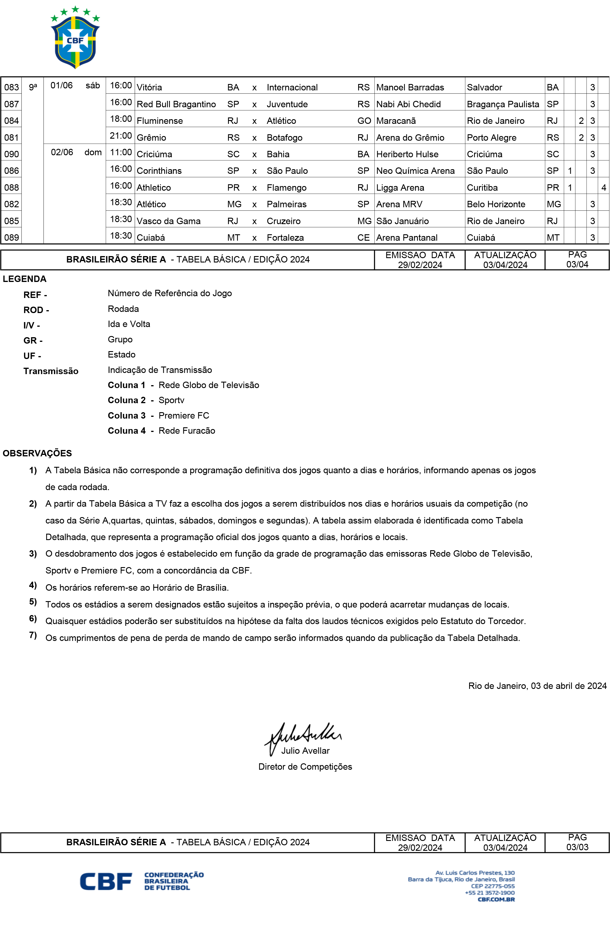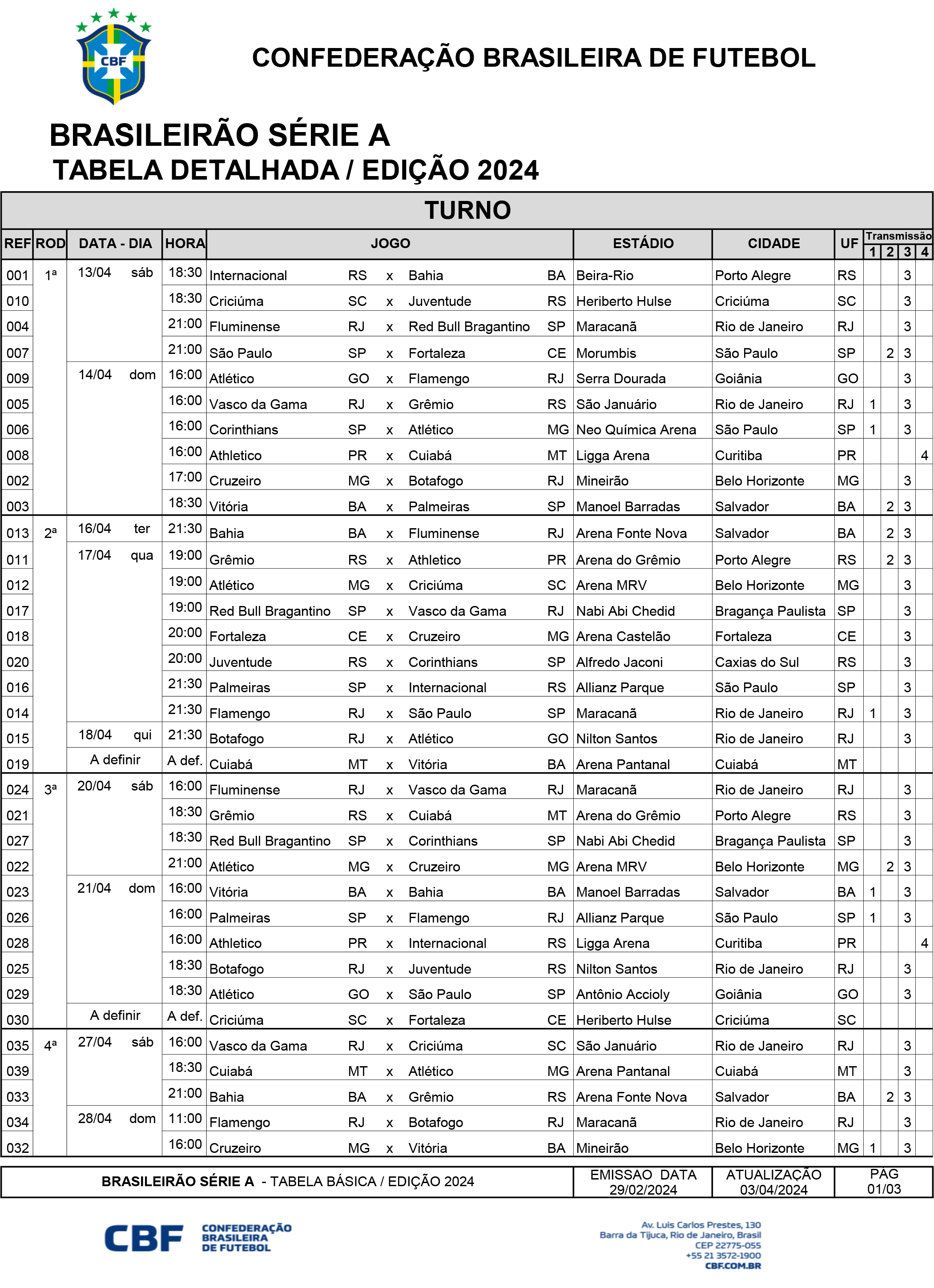 A CBF enfim divulgou, na madrugada desta quinta-feira (4/4), a tabela detalhada das nove primeiras rodadas do Campeonato Brasileiro-2024. O Botafogo vai estrear no dia 14 de abril (domingo), às 17h, contra o Cruzeiro, no Mineirão, com transmissão do Premiere.