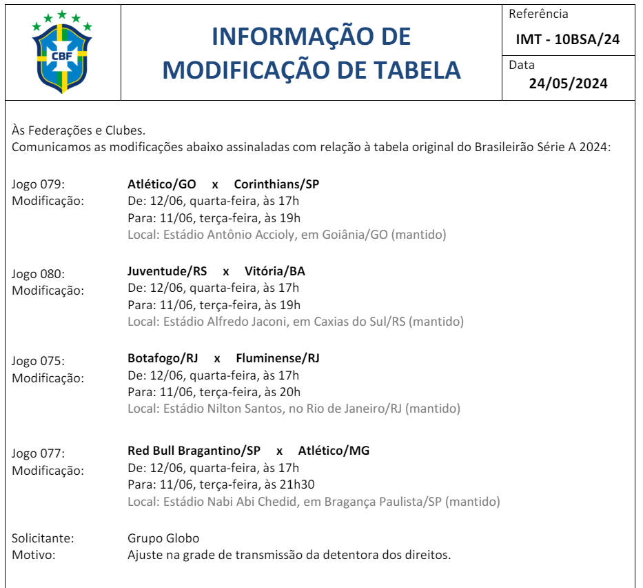 Além de Botafogo x Fluminense, os outros jogos que também estavam marcados para a tarde do dia 12 foram antecipados: Atlético-GO x Corinthians, Juventude x Vitória e Red Bull Bragantino x Atlético-MG também serão no dia 11.