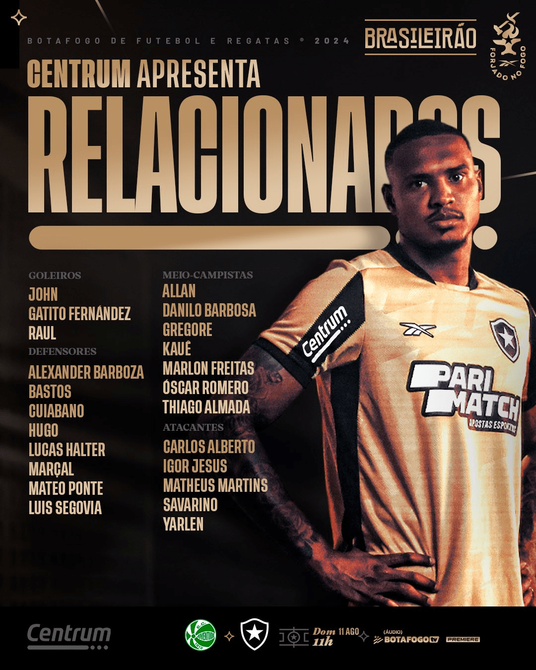 O Botafogo divulgou a lista de relacionados para o duelo contra o Juventude neste domingo, às 11h, no Estádio Alfredo Jaconi, pela 22ª rodada do Campeonato Brasileiro.
