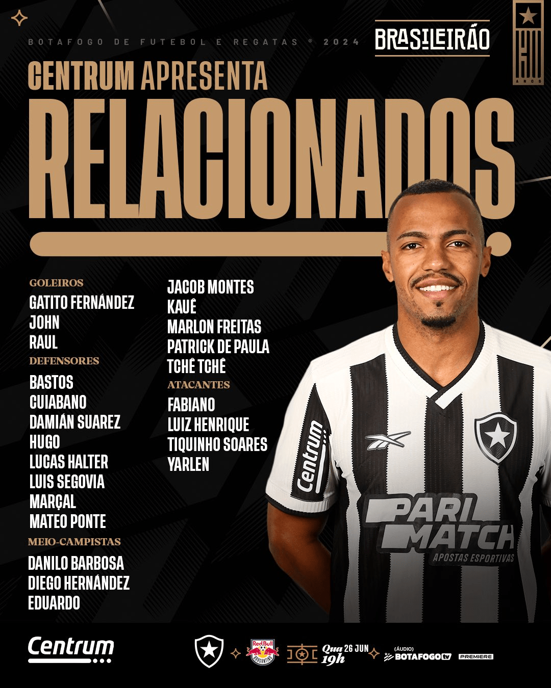 Com muitos desfalques, o Botafogo divulgou a lista de relacionados para encarar o Red Bull Bragantino nesta quarta-feira (26/6), às 19h, no Estádio Nilton Santos, pela 12ª rodada do Brasileirão-2024. As novidades são os retornos do zagueiro Luis Segovia, do meia Jacob Montes e do atacante Fabiano.