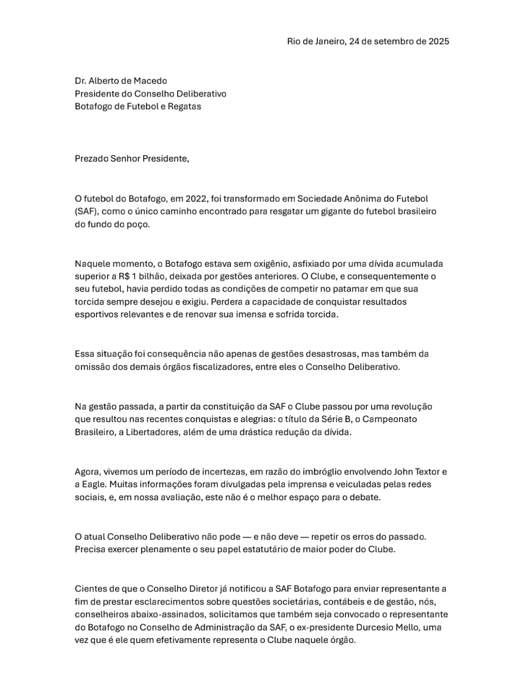 “(…) solicitamos que também seja convocado o representante do Botafogo no Conselho de Administração da SAF, o ex-presidente Durcesio Mello, uma vez que é ele quem efetivamente representa o Clube naquele órgão“, diz um trecho da carta.