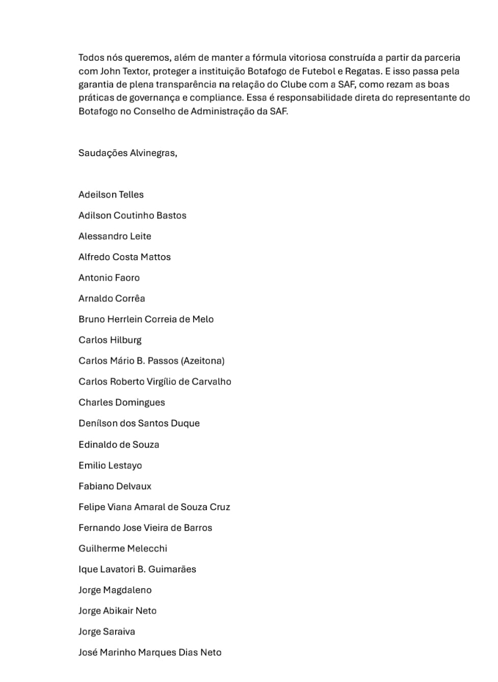 “Todos nós queremos, além de manter a fórmula vitoriosa construída a partir da parceria com John Textor, proteger a instituição Botafogo de Futebol e Regatas. E isso passa pela garantia de plena transparência na relação do Clube com a SAF, como rezam as boas práticas de governança e compliance. Essa é responsabilidade direta do representante do Botafogo no Conselho de Administração da SAF“, encerra o documento (veja a íntegra abaixo).
