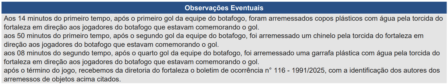 O árbitro acrescentou que a diretoria do Fortaleza disponibilizou um Boletim de Ocorrência com a identificação dos autores dos arremessos, o que pode acabar ajudando o clube numa eventual denúncia no STJD.
