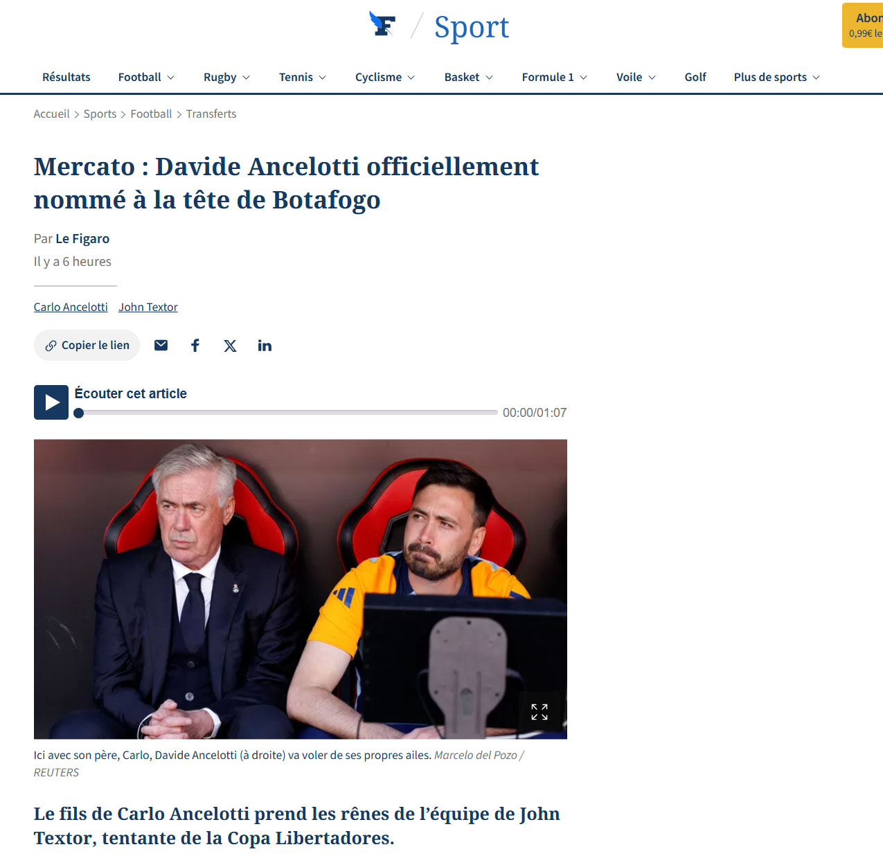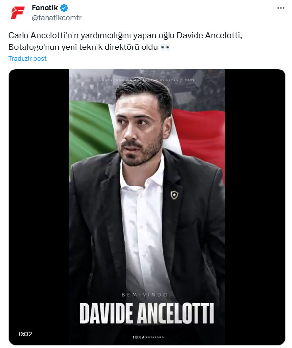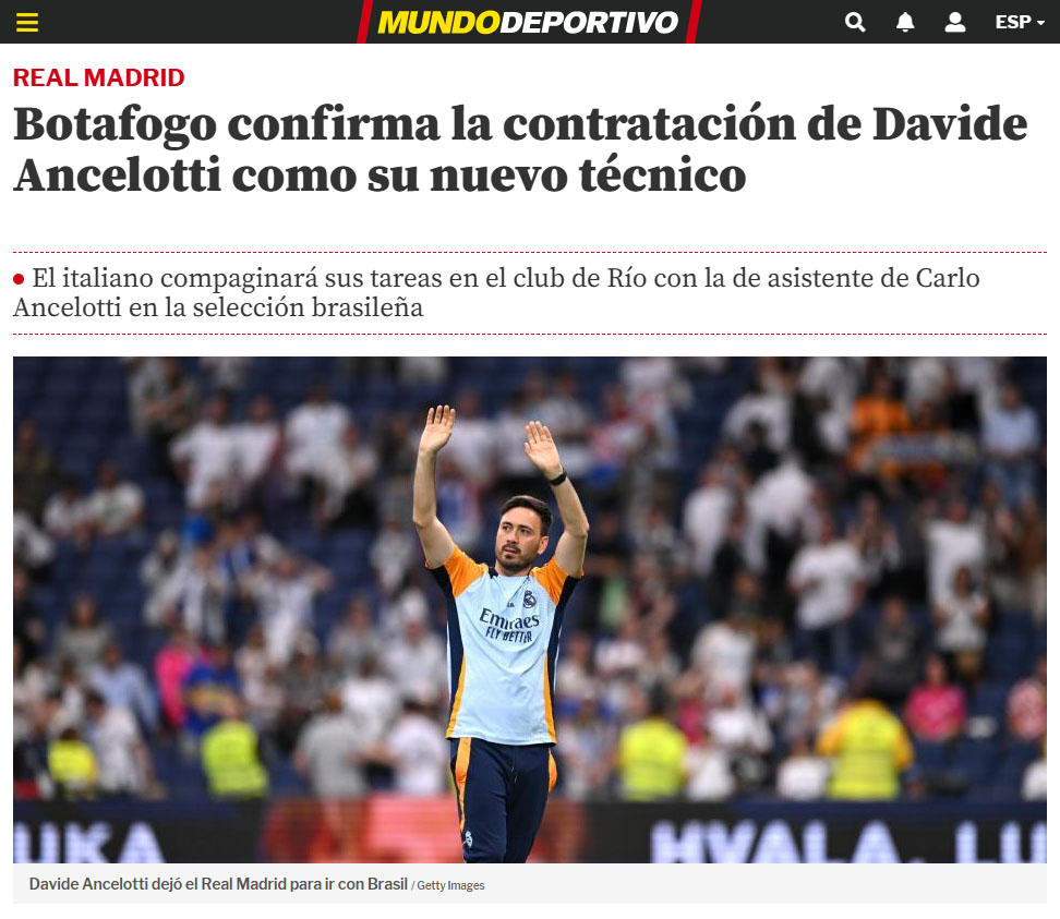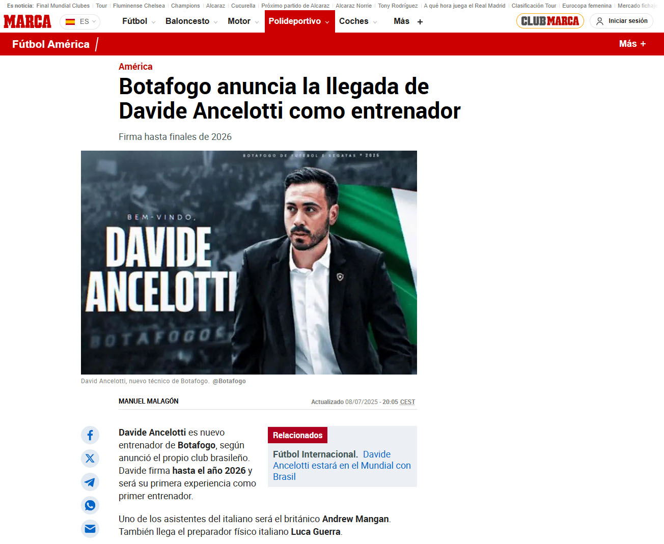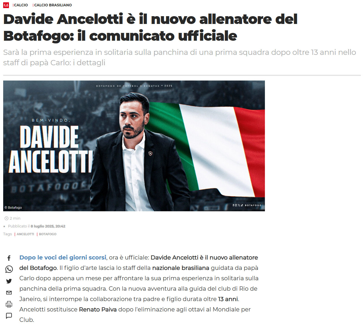 Veja abaixo a repercussão internacional de Davide Ancelotti no Botafogo: