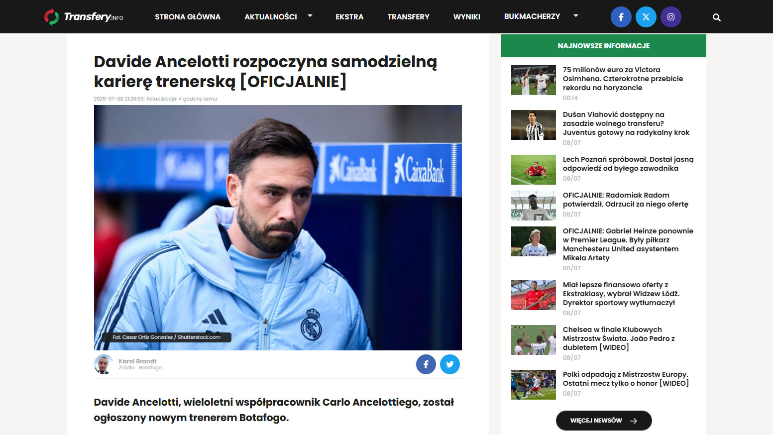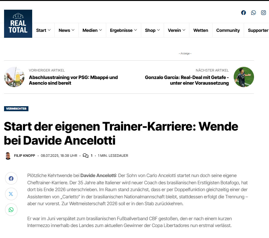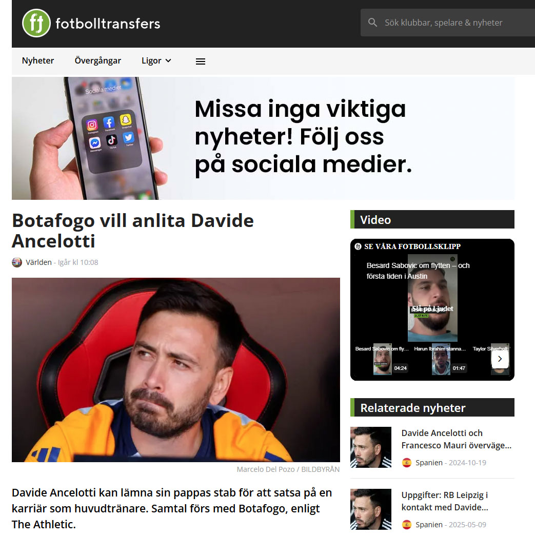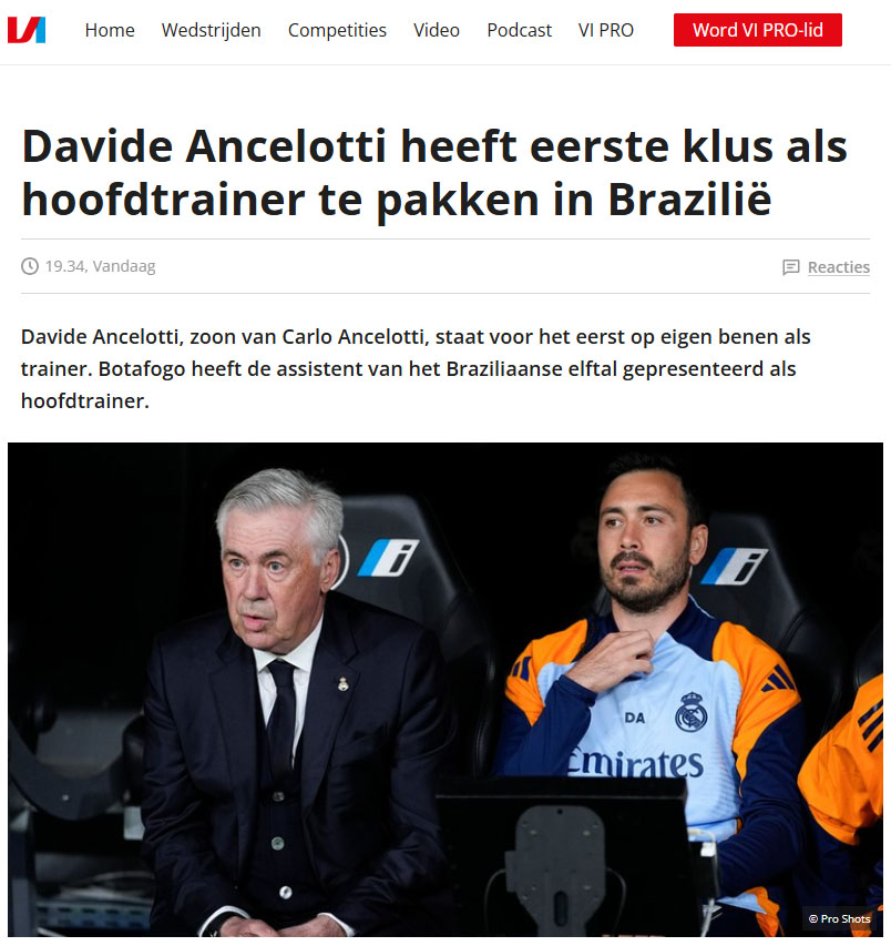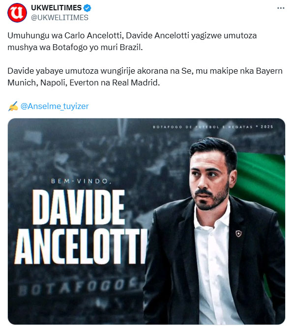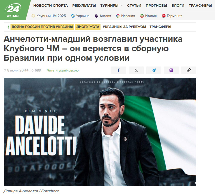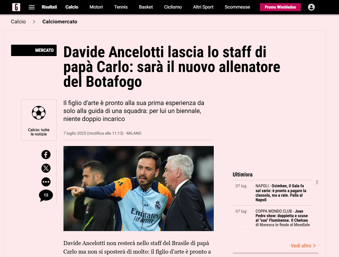 Veja abaixo a repercussão internacional de Davide Ancelotti no Botafogo: