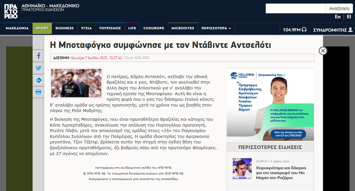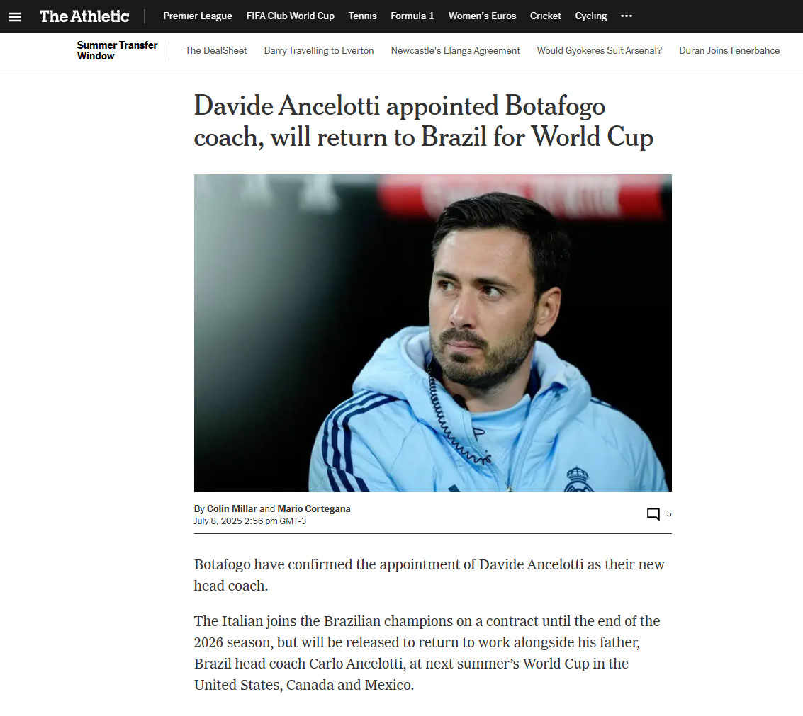 A contratação de Davide Ancelotti pelo Fogão rendeu mais destaque na Itália, país de nascimento do treinador, e na Espanha, onde o pai, Carlo Ancelotti, fez história liderando o Real Madrid.