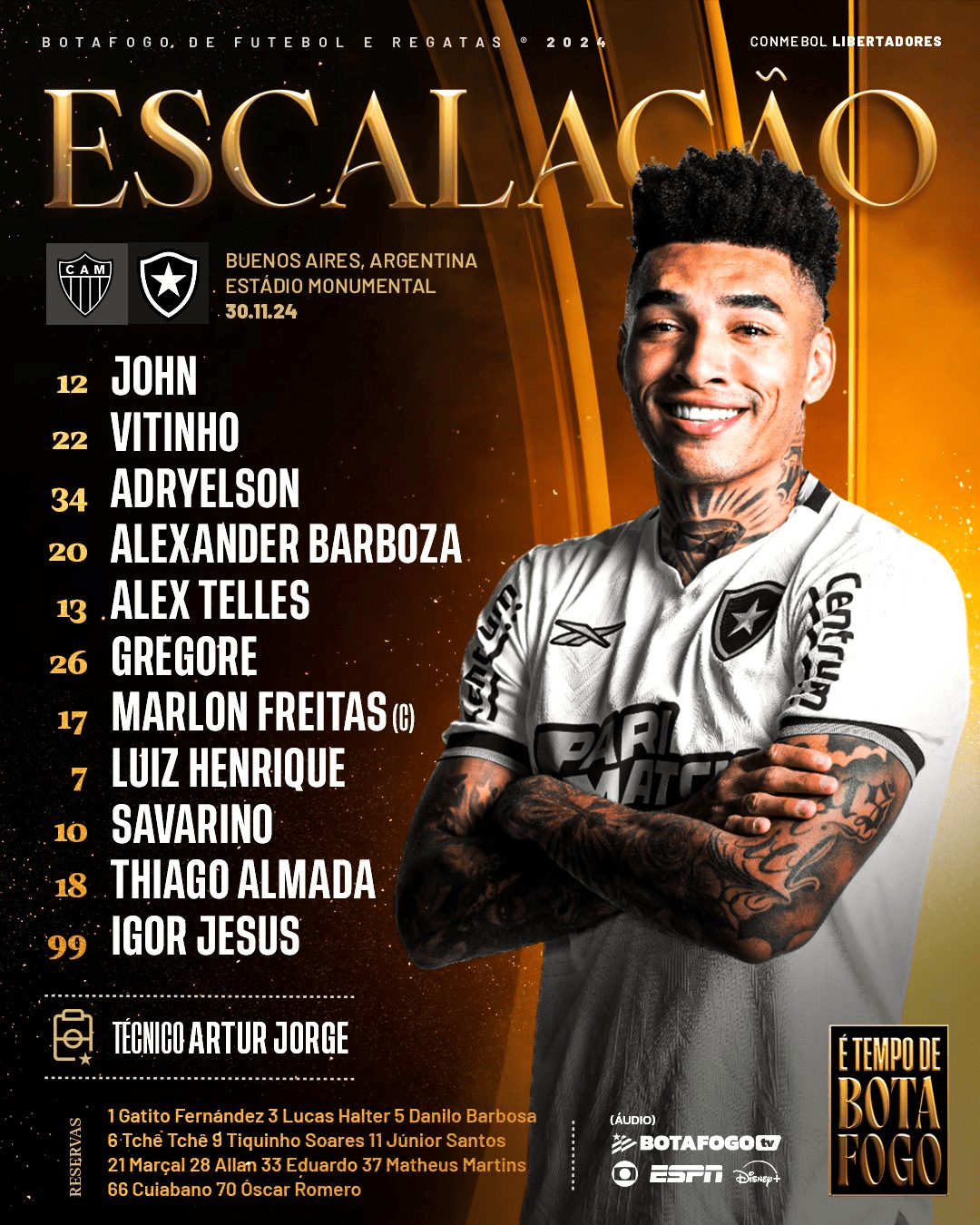 O Botafogo está oficialmente escalado pelo técnico Artur Jorge para a final da Libertadores logo mais neste sábado, às 17h, no Mâs Monumental, em Buenos Aires.