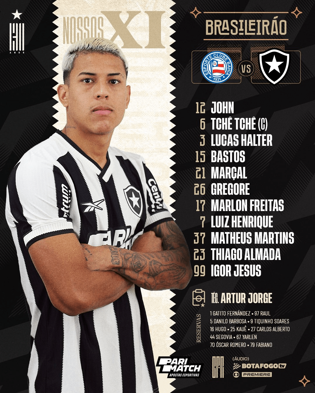 O Glorioso irá a campo com John; Tchê Tchê, Lucas Halter, Bastos e Marçal; Gregore, Marlon Freitas e Thiago Almada; Luiz Henrique, Igor Jesus e Matheus Martins.