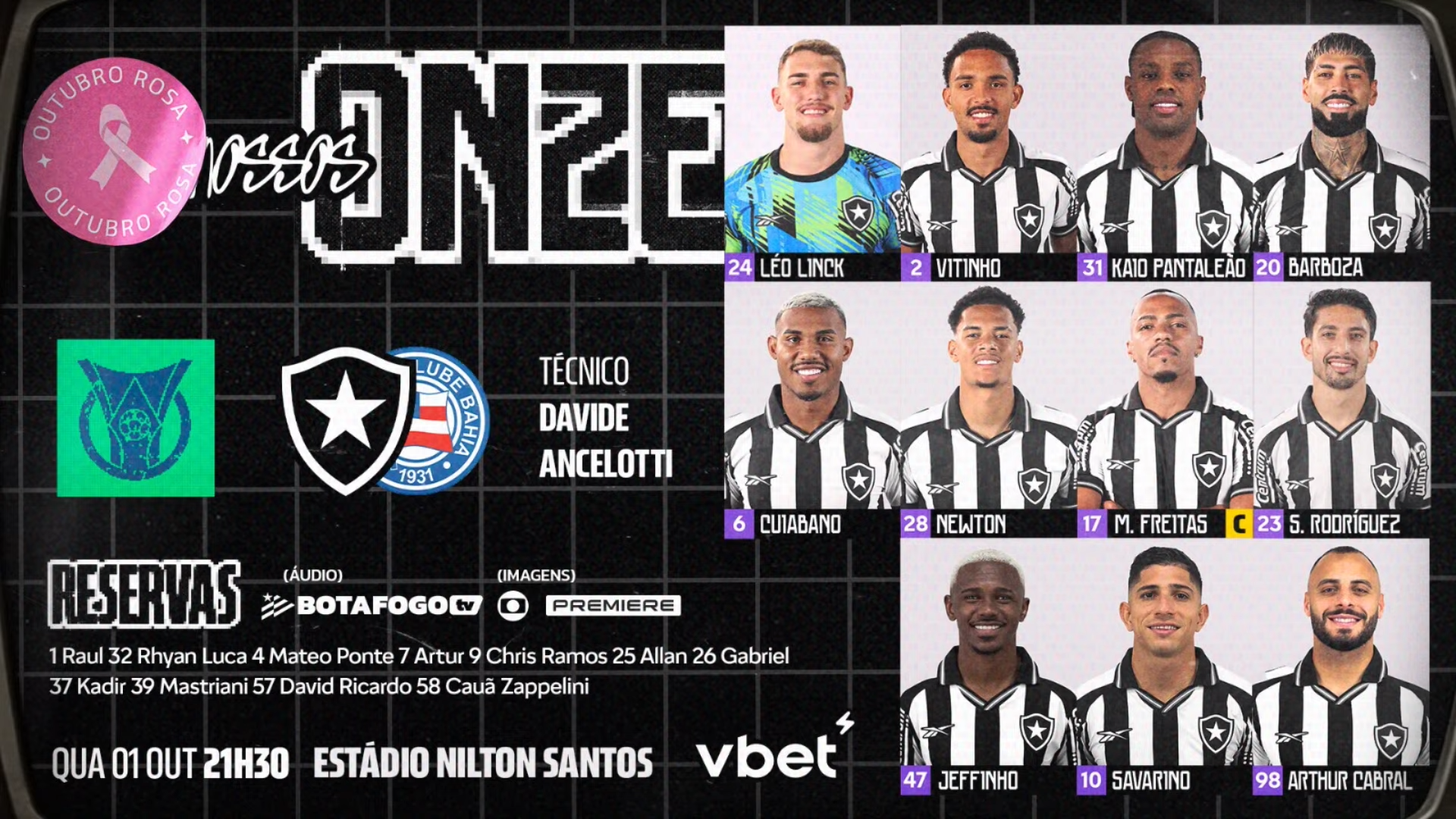 O Botafogo está escalado pelo técnico Davide Ancelotti para enfrentar o Bahia logo mais nesta quarta-feira (1/10), às 21h30, no Estádio Nilton Santos, pela 26ª rodada do Campeonato Brasileiro.