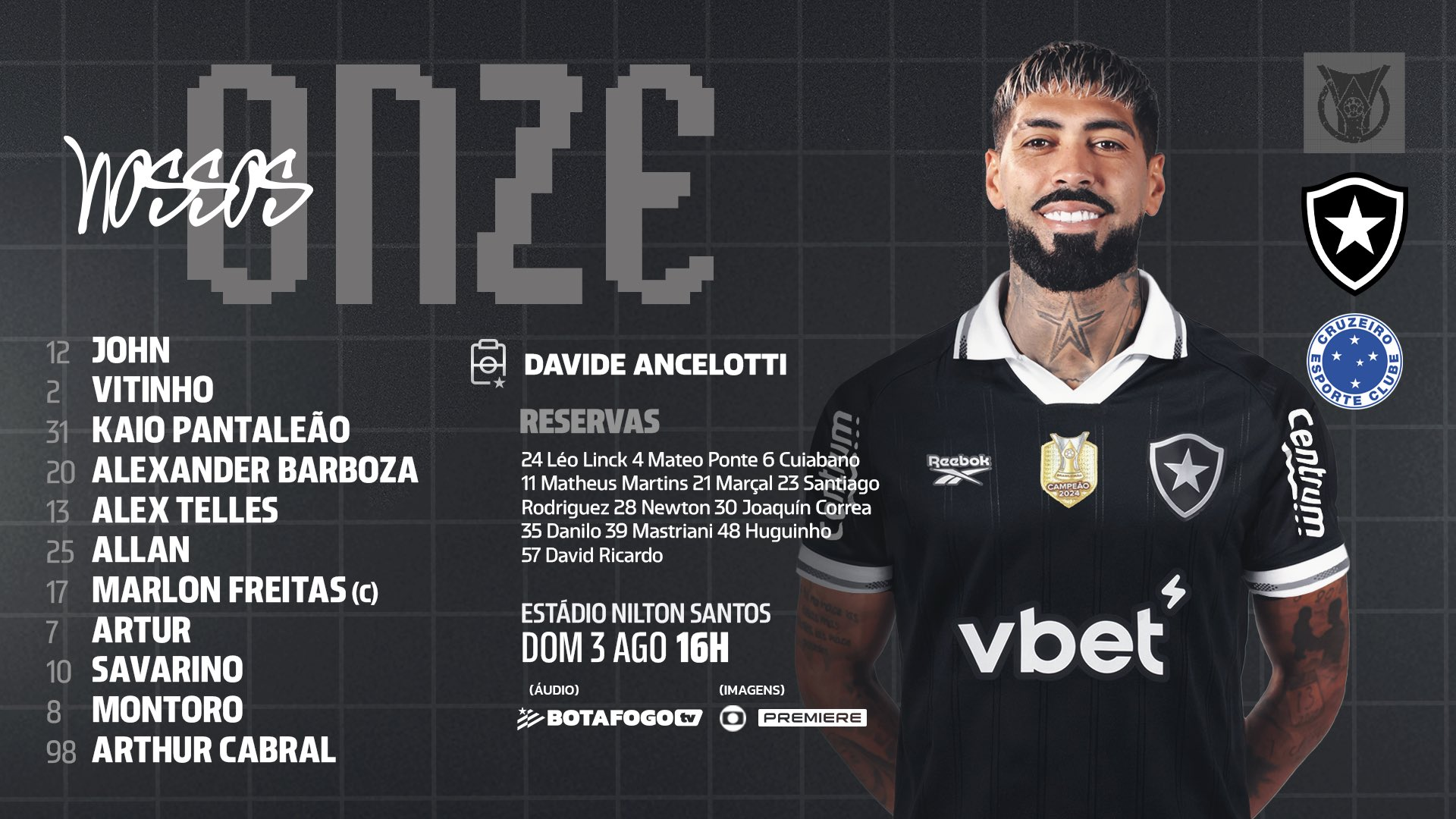 O Botafogo está escalado pelo técnico Davide Ancelotti para enfrentar o Cruzeiro logo mais neste domingo (3/8), às 16h, no Estádio Nilton Santos, pela 18ª rodada do Campeonato Brasileiro.