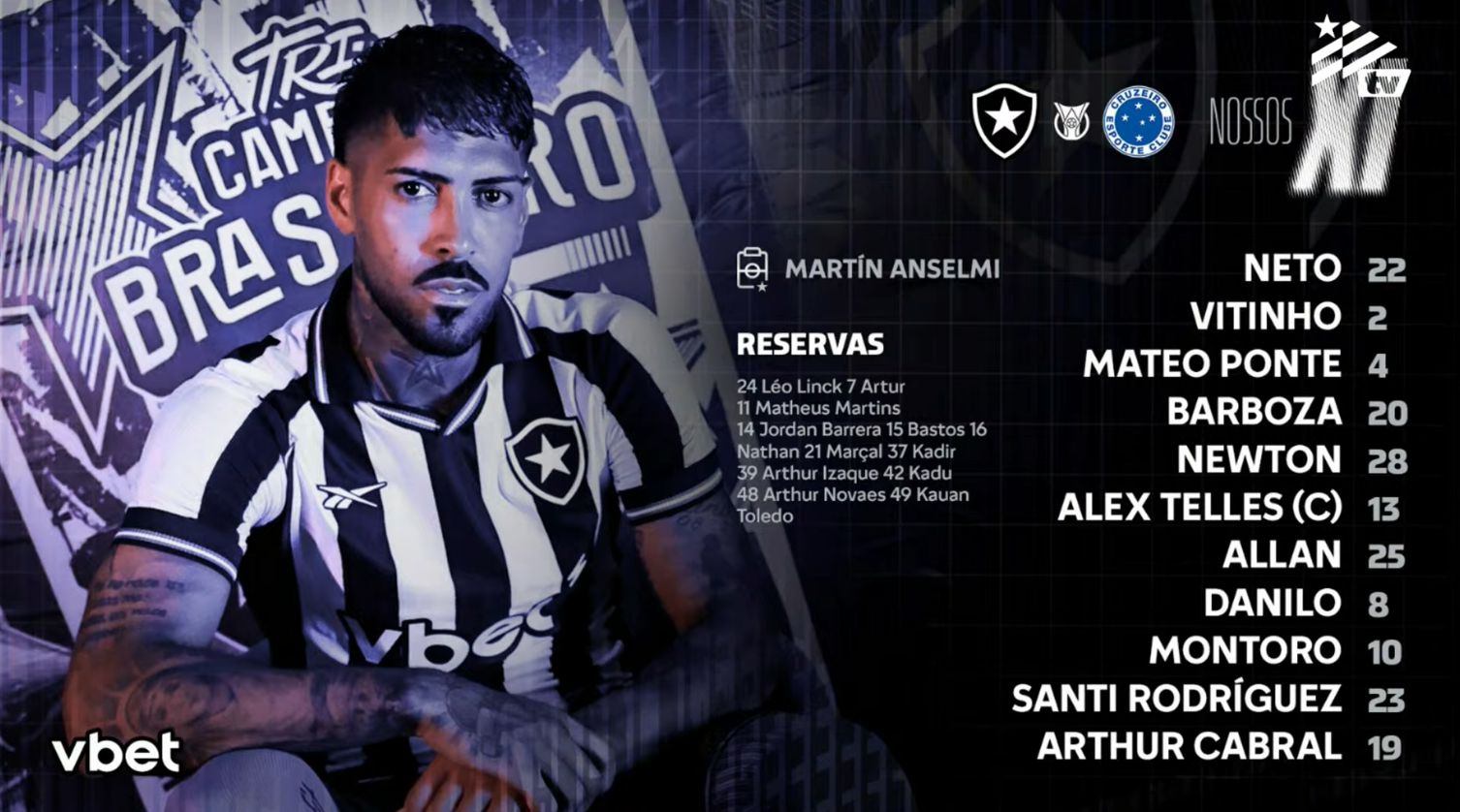 O Botafogo está escalado pelo técnico Martín Anselmi para a estreia no Campeonato Brasileiro diante do Cruzeiro nesta quinta-feira (29/1), às 21h30, no Estádio Nilton Santos.