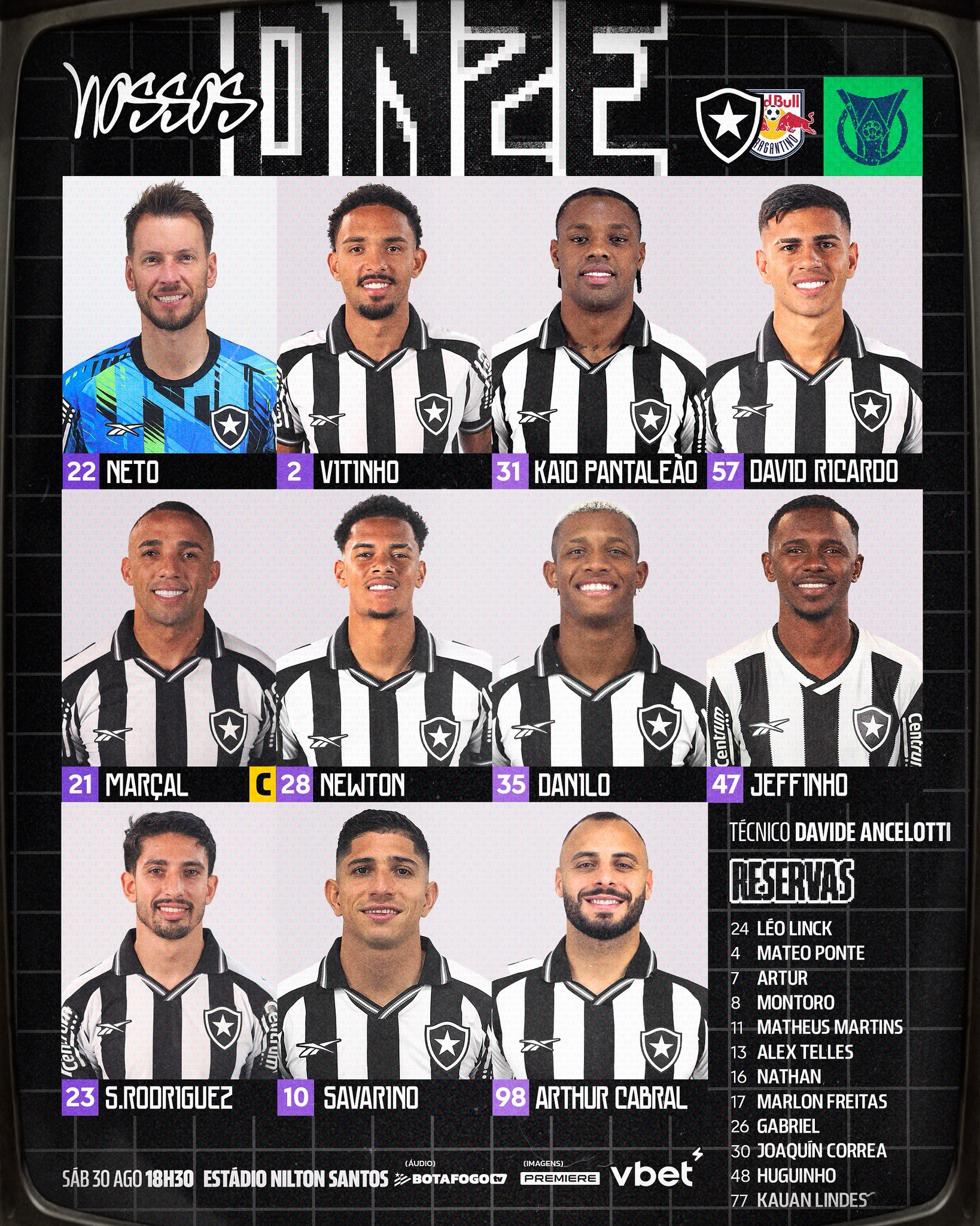 Com sete mudanças, o Botafogo está escalado pelo técnico Davide Ancelotti para enfrentar o Red Bull Bragantino logo mais neste sábado (30/8), às 18h30, no Estádio Nilton Santos, pela 22ª rodada do Campeonato Brasileiro.