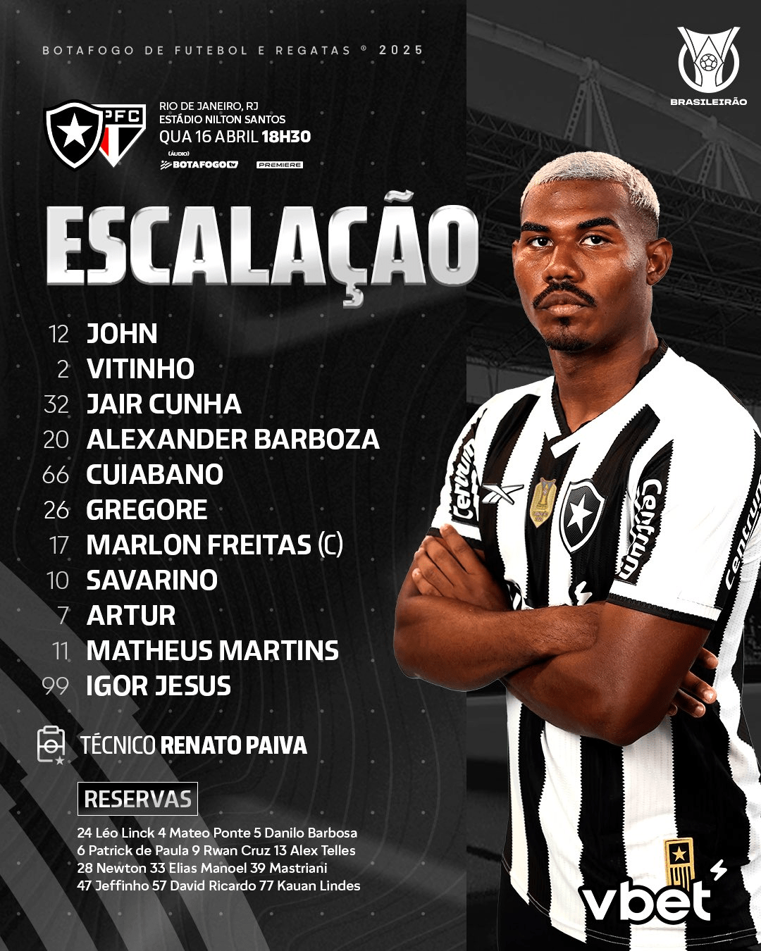 O Botafogo está escalado pelo técnico Renato Paiva para o jogo contra o São Paulo logo mais nesta quarta-feira (16/4), às 18h30, no Estádio Nilton Santos, pela quarta rodada do Campeonato Brasileiro.