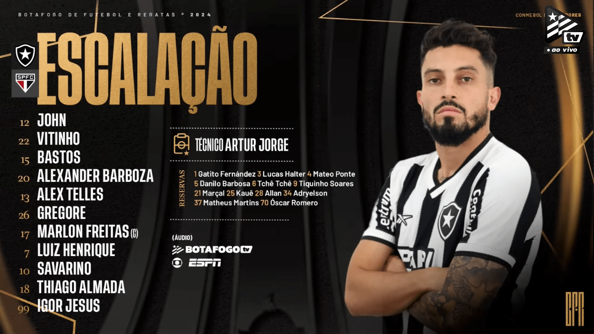 O Botafogo está escalado pelo técnico Artur Jorge para enfrentar o São Paulo logo mais nesta quarta-feira (18/9), às 21h30, no Estádio Nilton Santos, pela partida de ida das quartas de final da Libertadores-2024.