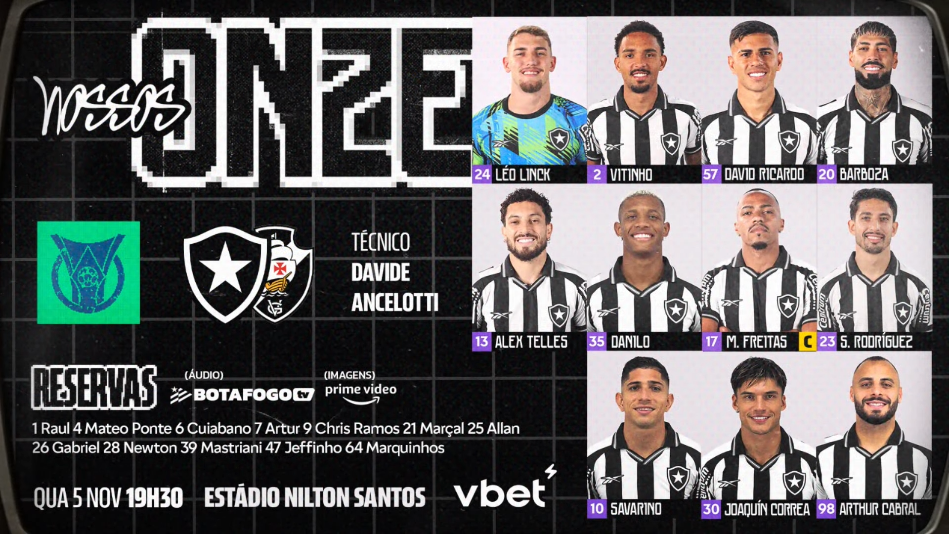 O Botafogo está escalado pelo técnico Davide Ancelotti para enfrentar o Vasco logo mais nesta quarta-feira (5/11), às 19h30, no Nilton Santos, pela 32ª rodada do Campeonato Brasileiro.