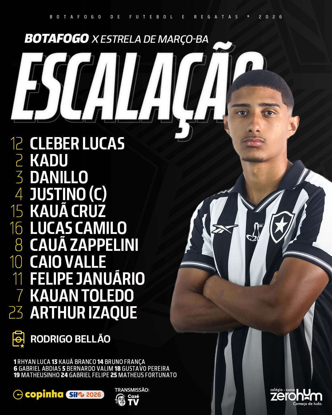 No banco de reservas, as opções são Rhyan Luca, Kauã Branco, Bruno França, Gabriel Abdias, Bernardo Valim, Gustavo Pereira, Matheusinho, Gabriel Felipe e Matheus Fortunato.