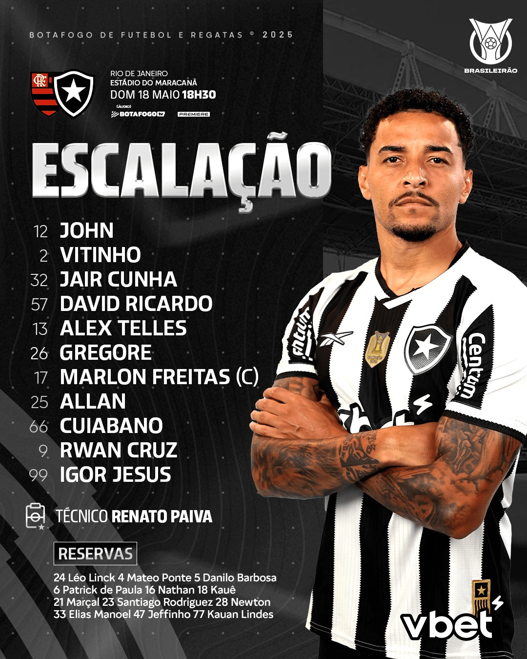 O Botafogo está escalado pelo técnico Renato Paiva para o clássico de logo mais, neste domingo (18/5), contra o Flamengo, às 18h30, no Maracanã, pela 9ª rodada do Campeonato Brasileiro.