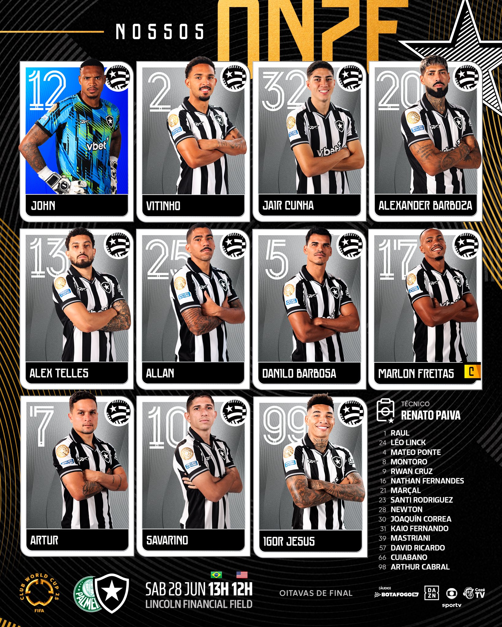 O Botafogo está escalado oficialmente pelo técnico Renato Paiva para enfrentar o Palmeiras logo mais neste sábado, às 13h (de Brasília), no Lincoln Financial Field, pelas oitavas de final da Copa do Mundo de Clubes.