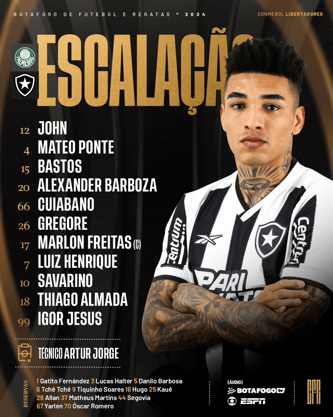 O Botafogo está escalado pelo técnico Artur Jorge sem mudanças para a partida contra o Palmeiras logo mais nesta quarta-feira (21/8), às 21h30, no Allianz Parque, pelas oitavas de final da Libertadores-2024.