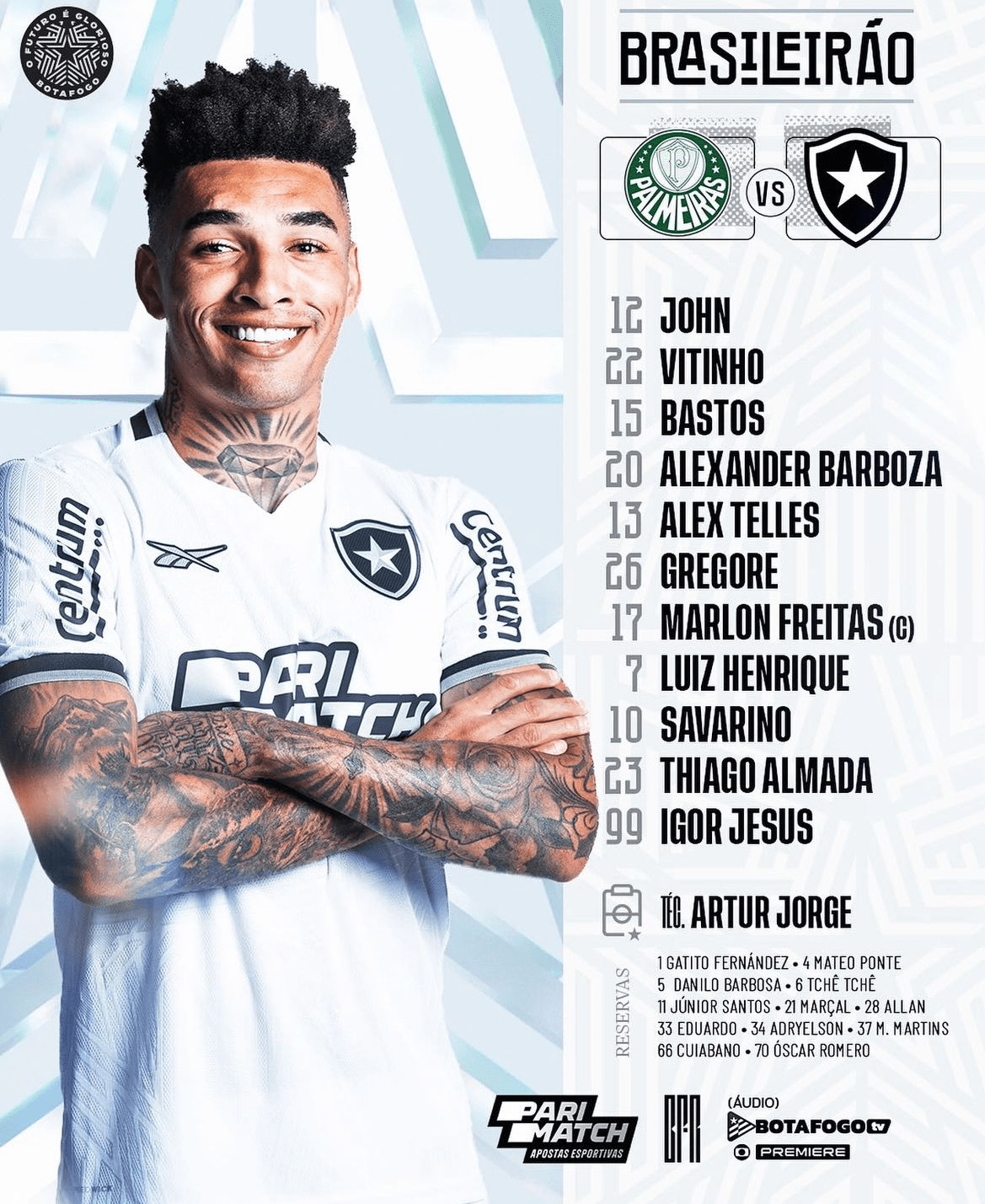 O Botafogo está escalado pelo técnico Artur Jorge para o duelo contra o Palmeiras nesta terça-feira (26/11), às 21h30, no Allianz Parque, pela 36ª e antepenúltima rodada do Campeonato Brasileiro-2024.
