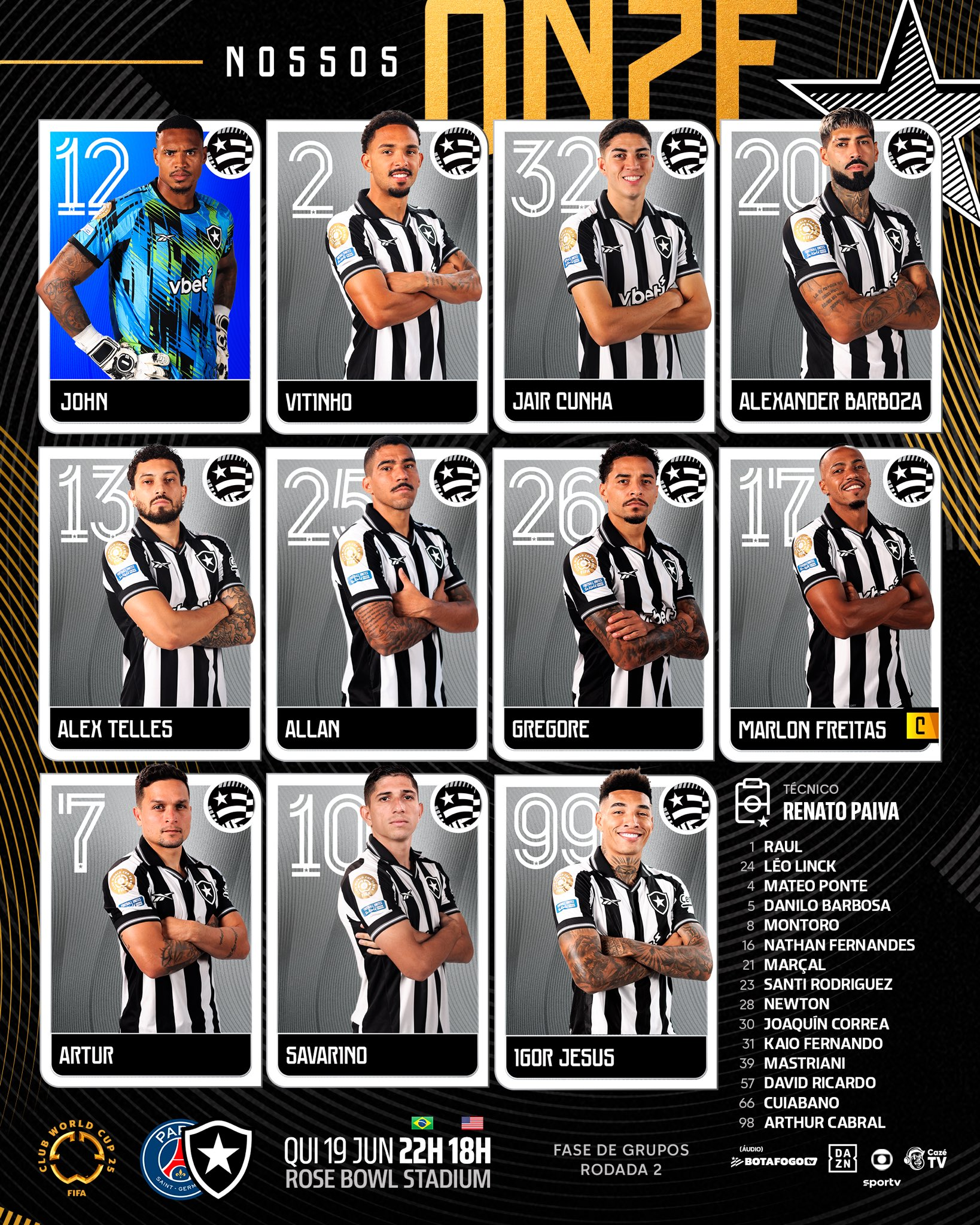 O Botafogo está escalado pelo técnico Renato Paiva para enfrentar o PSG logo mais nesta quinta-feira (19/6), às 22h (de Brasília), no Rose Bowl, em Los Angeles (EUA), pela segunda rodada do Grupo B da Copa do Mundo de Clubes.