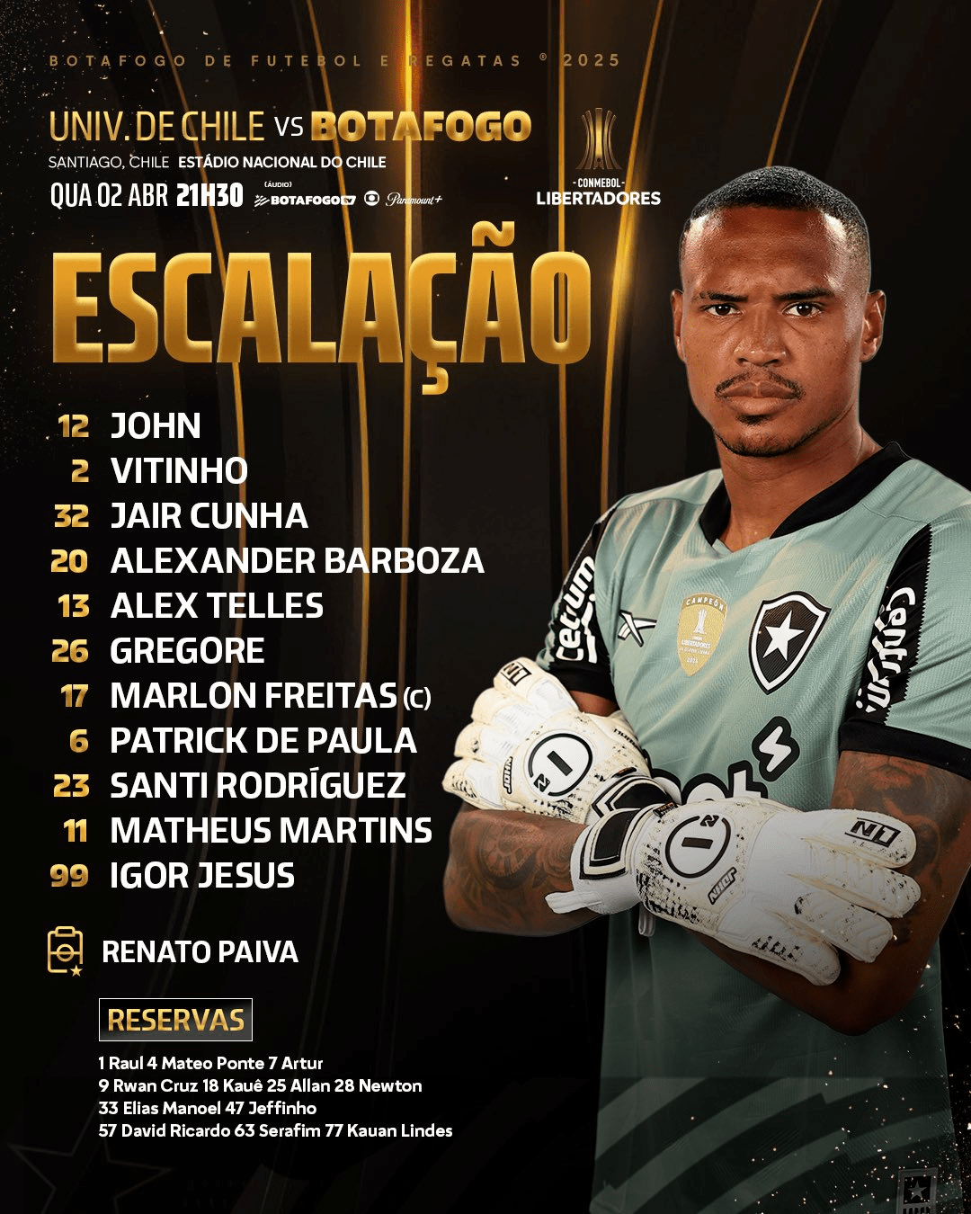O Botafogo está escalado pelo técnico Renato Paiva para a estreia na Libertadores contra a Universidad de Chile logo mais nesta quarta (2/4), às 21h30, no Estádio Nacional, em Santiago.