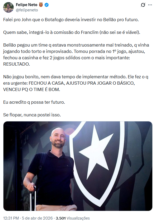 “Falei para o John que o Botafogo deveria investir no Bellão para o futuro. Quem sabe, integrá-lo à comissão do Franclim (não sei se é viável). Eu acredito que possa ter futuro. Se flopar, nunca postei isso”, escreveu Felipe Neto, elogiando o interino: