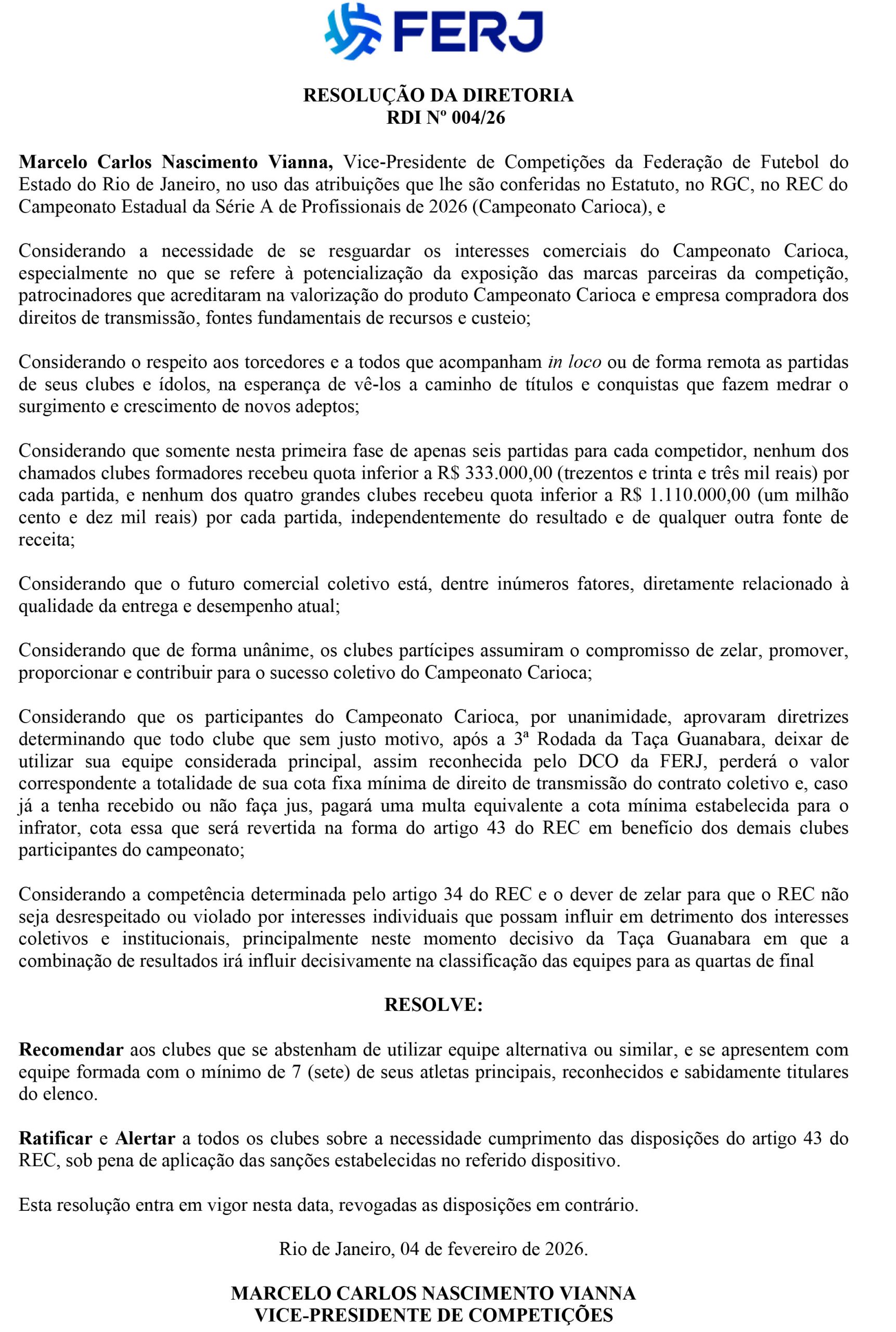 Veja o documento publicado pela Ferj: