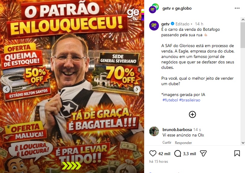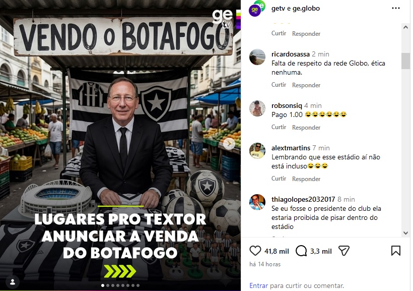 Em postagem conjunta no Instagram, GE TV e GE ironizaram o anúncio de que a SAF do Botafogo está à venda, feita pela administradora Cork Gully LLP em um jornal britânico. Os perfis ligados ao Grupo Globo usaram imagens geradas por IA (inteligência artificial) para caçoar do clube e de John Textor.