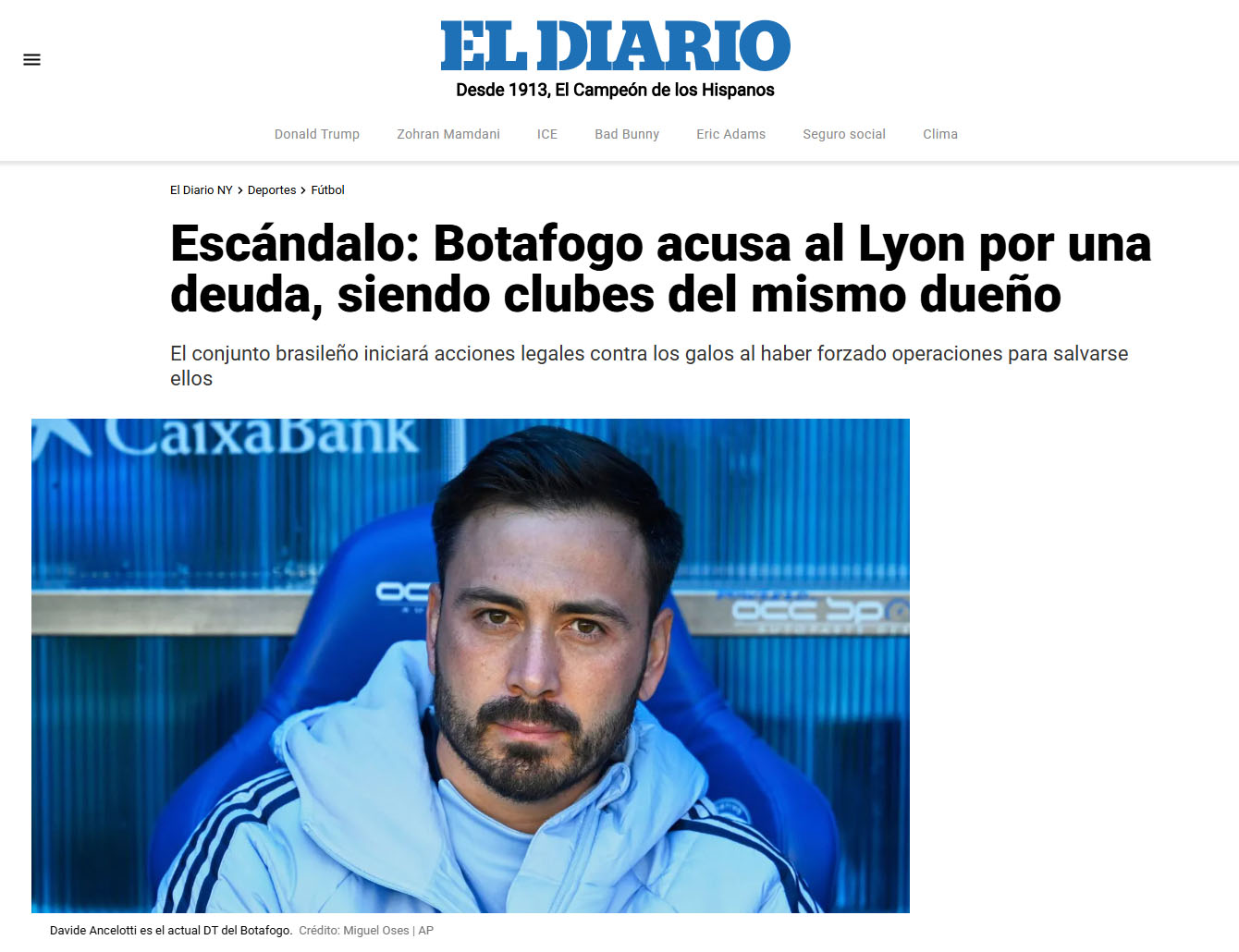 “Surreal: Botafogo acusa Lyon de dívida… mesmo sendo clubes do mesmo dono!“, destacou o “Sport”. Já o “El Diario”, publicação em língua espanhola de Nova York (EUA), manchetou: “Escândalo: Botafogo acusa Lyon por uma dívida, sendo clubes do mesmo dono“.