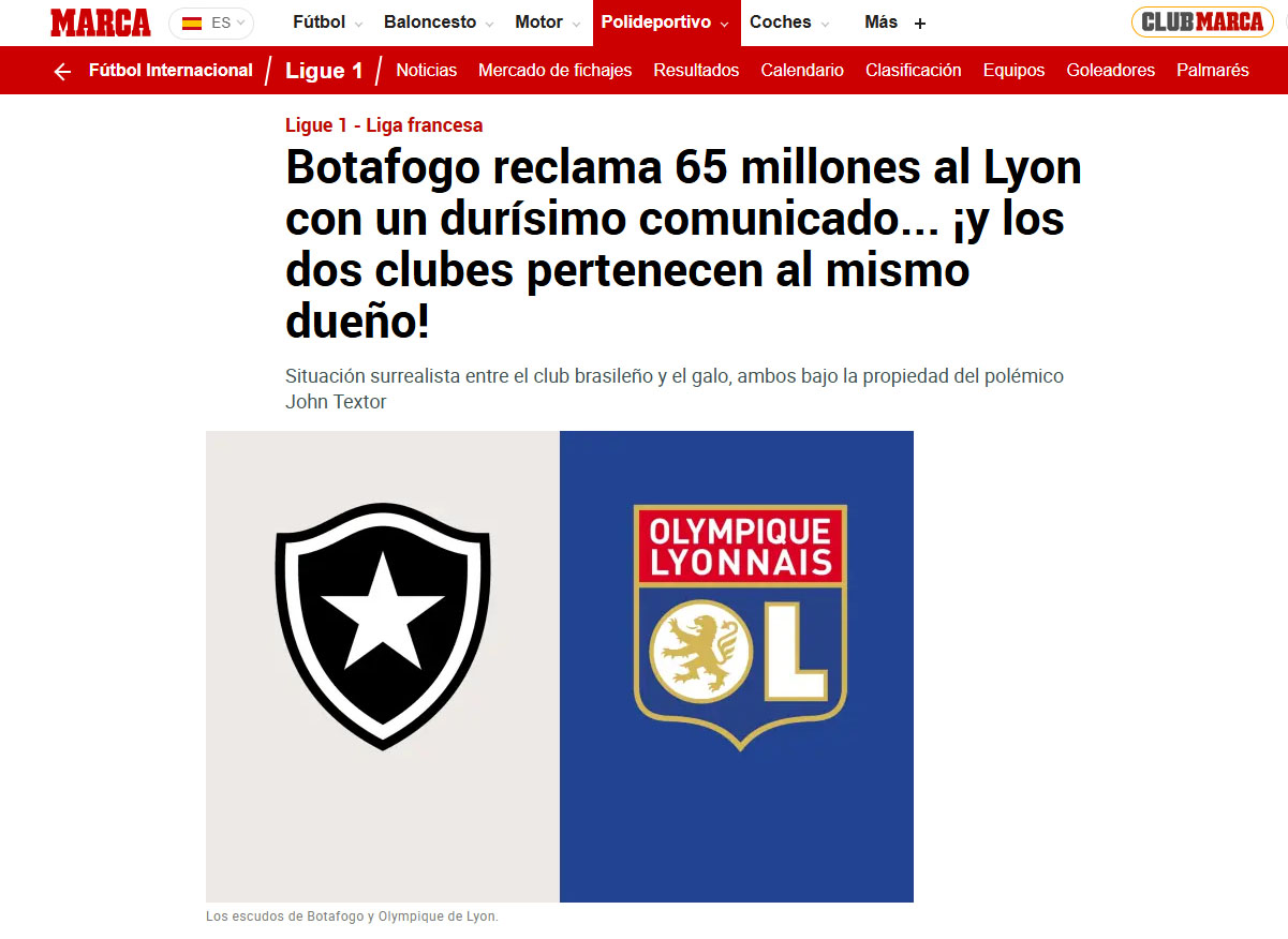 Um dos principais jornais esportivos da Espanha, o “Marca” fez uma extensa reportagem com o título: “Botafogo exige € 65 milhões do Lyon com declaração dura… e os dois clubes são do mesmo dono!“. No texto, a lembrança de que o Alvinegro disse ter vendido Luiz Henrique, Igor Jesus e Jair por preços abaixo do mercado para ajudar o então parceiro de holding.