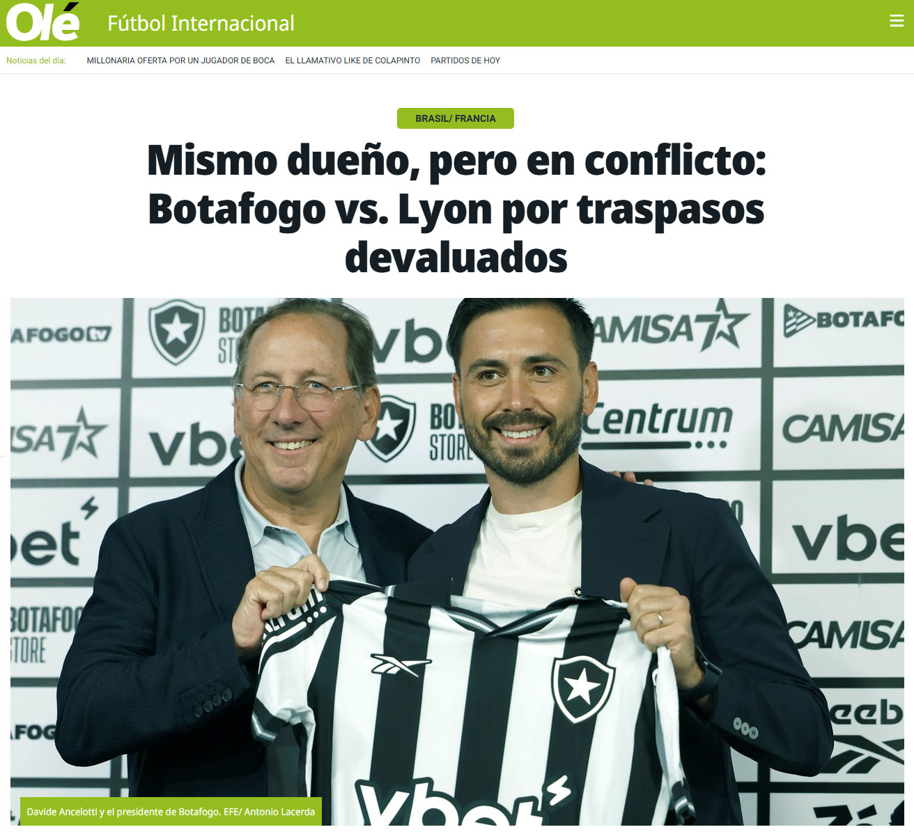 Além de jornais franceses, obviamente, publicações como “Marca” e “Sport“, da Espanha, e o “Olé“, da Argentina, citaram o fato de que o Botafogo está cobrando valores do Lyon mesmo com ambos pertencendo a Textor.