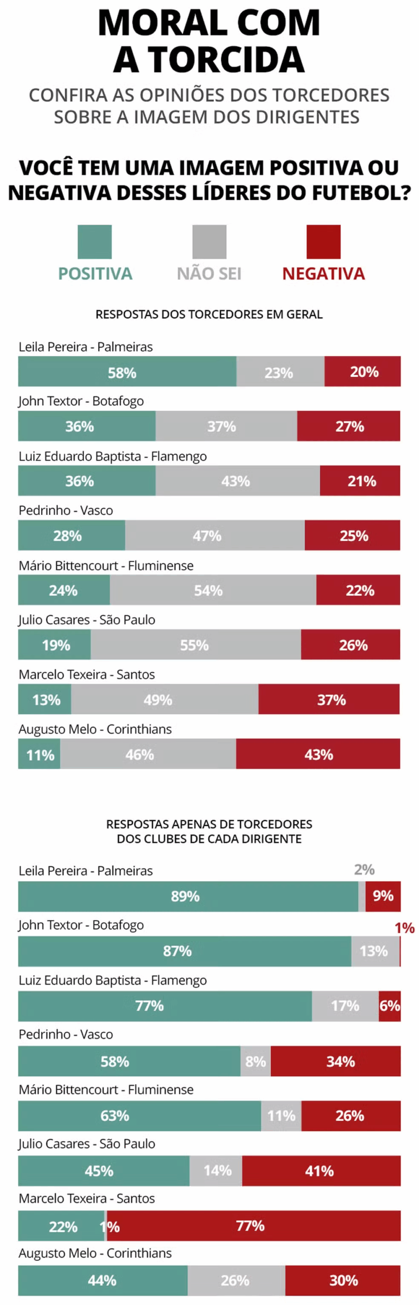 Entre os torcedores do próprio clube, John Textor fica também atrás apenas de Leila Pereira, que tem avaliação positiva de 89% dos palmeirenses e negativa de 9%. A maior rejeição é de Marcelo Teixeira, reprovado por 76,8% dos torcedores do Santos.