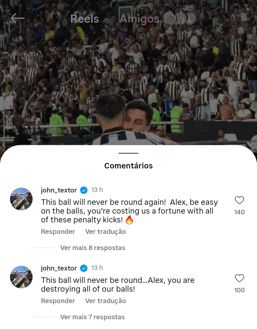 “Essa bola nunca mais será redonda novamente! Alex, tenha calma com essas bolas, você está nos custando uma fortuna com essas cobranças de pênalti! Você está destruindo todas as nossas bolas! 🔥”, comentou Textor.