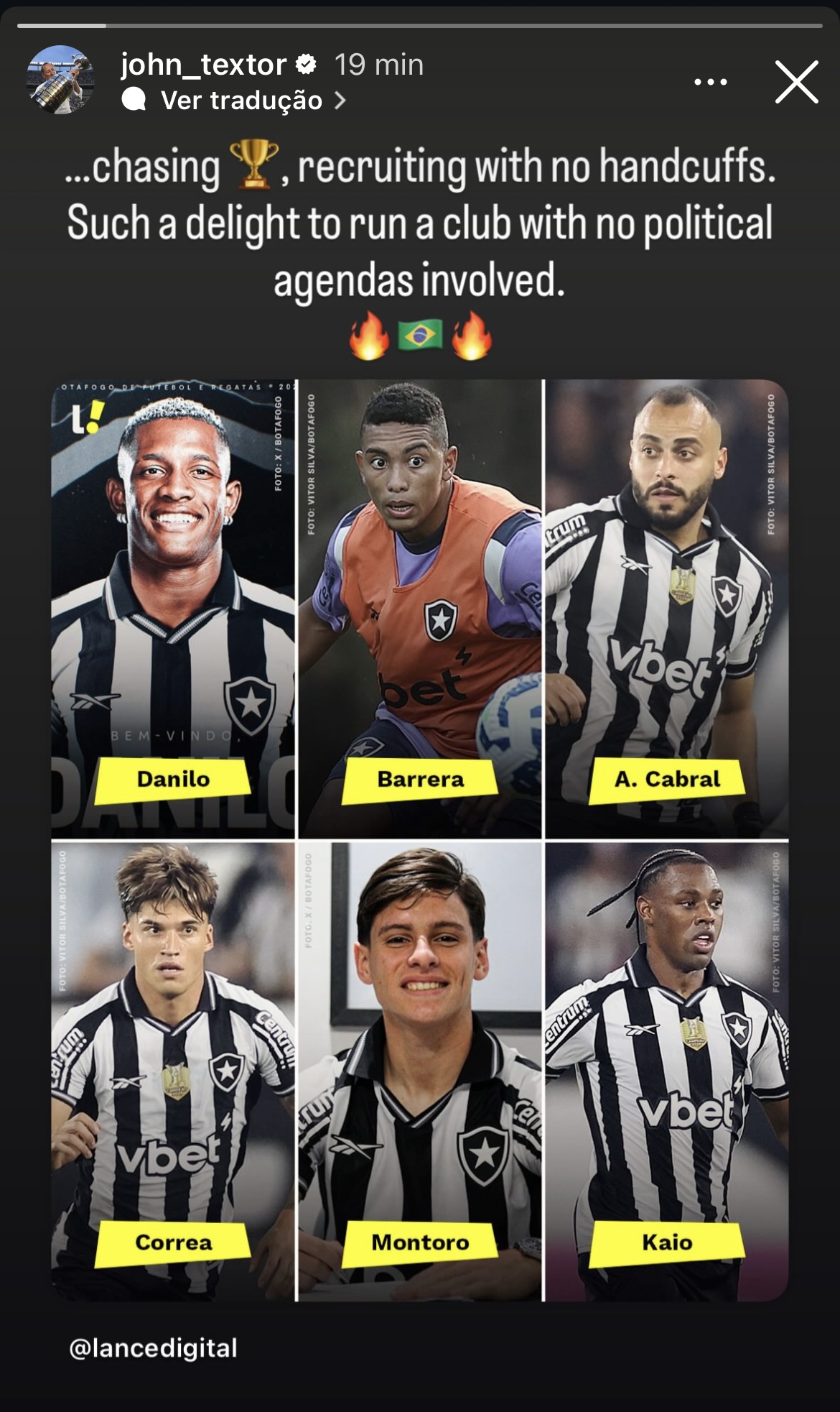 Mais presente na administração do Botafogo, após se afastar do Lyon, John Textor celebrou as contratações recentes e as perspectivas do clube. Ele aproveitou para deixar uma ironia no Instagram à situação que viveu na França.