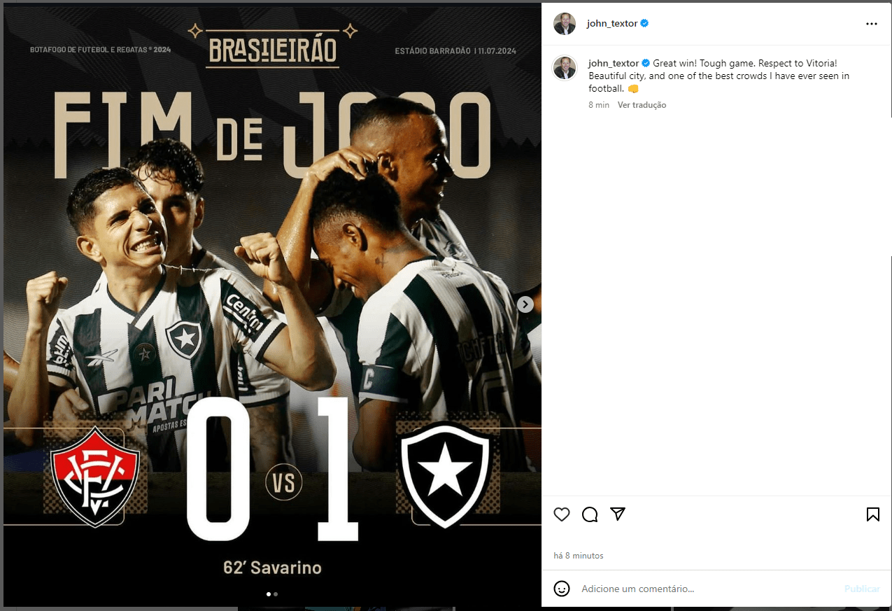 “Grande vitória! Jogo difícil. Respeito ao Vitória! Cidade linda, e uma das melhores torcidas que já vi no futebol“, escreveu John Textor no Instagram.