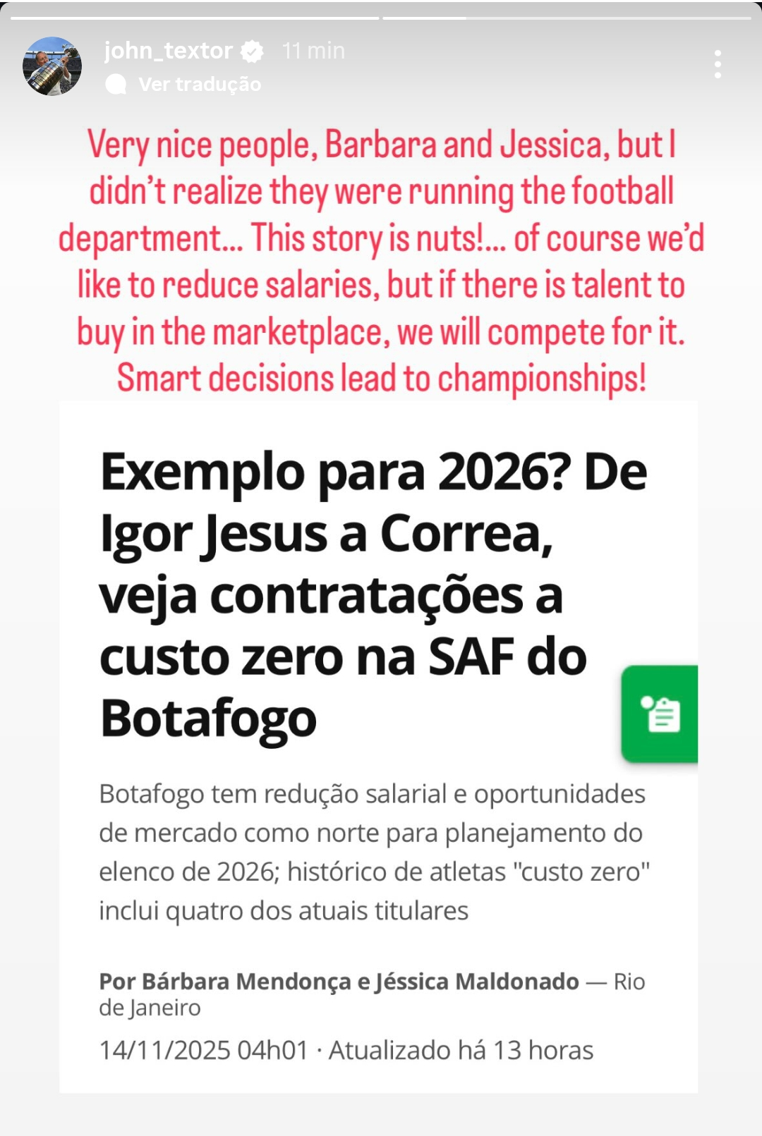 “Pessoas muito legais, Bárbara [Mendonça] e Jéssica [Maldonado, repórteres que assinam a matéria], mas eu não sabia que elas estavam administrando o departamento de futebol… Essa reportagem é uma loucura! Claro que gostaríamos de reduzir os salários, mas se houver talento disponível no mercado, vamos competir por ele. Decisões inteligentes levam aos títulos!“, escreveu Textor.