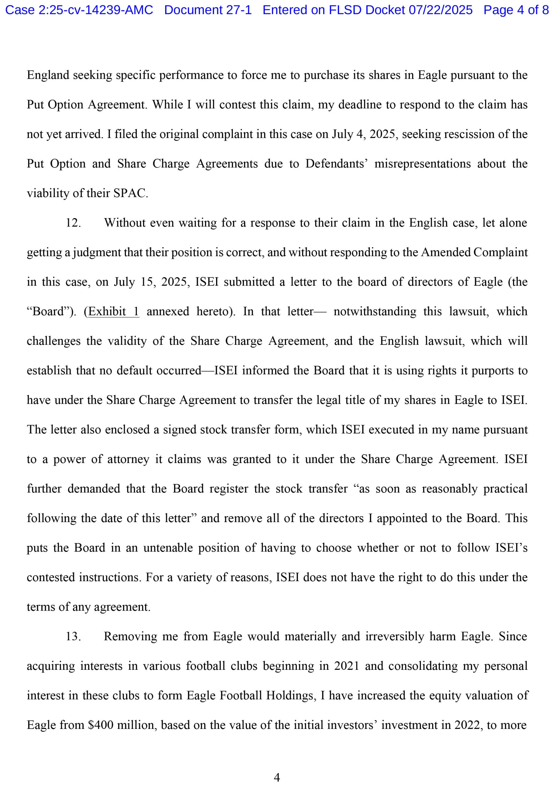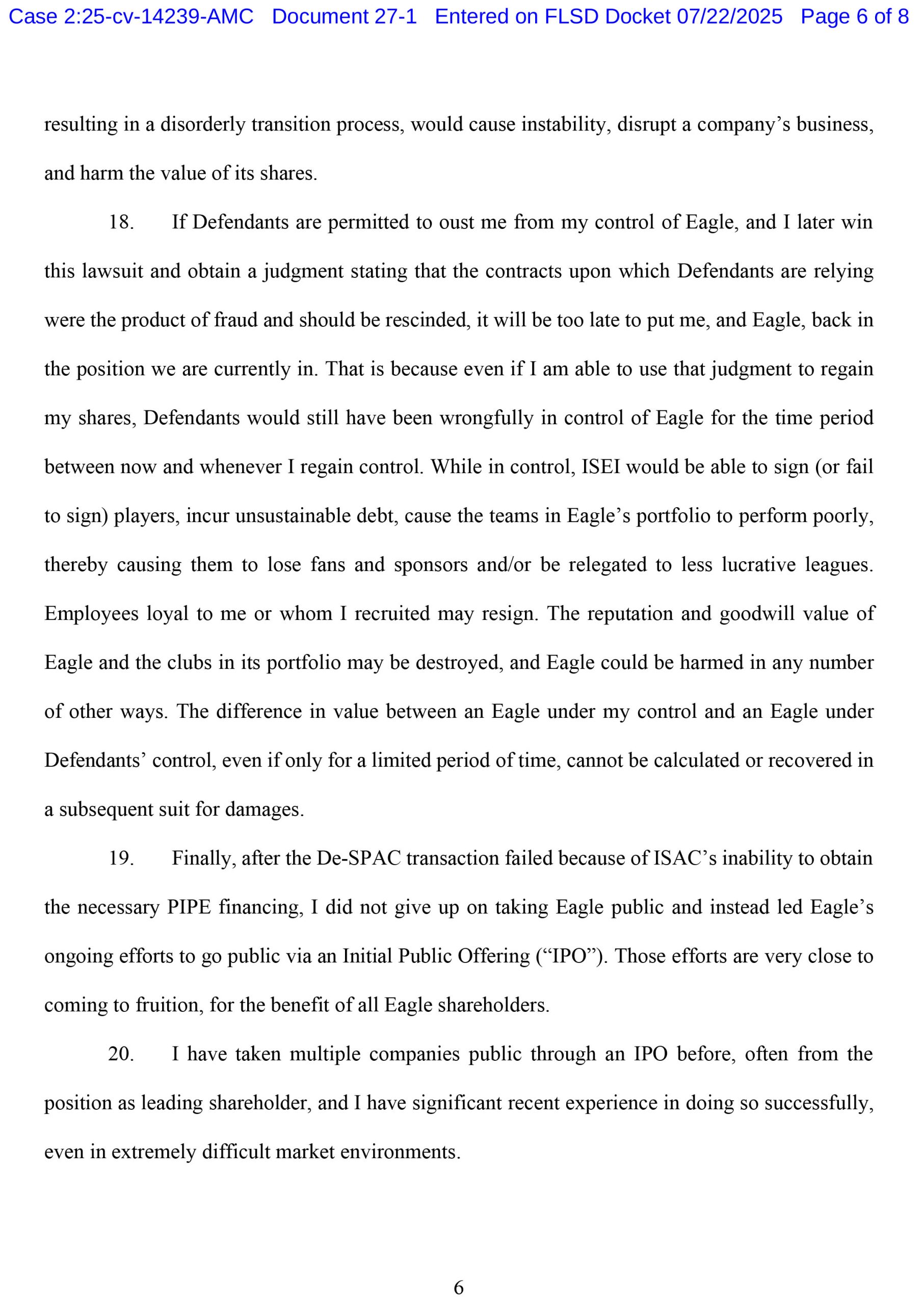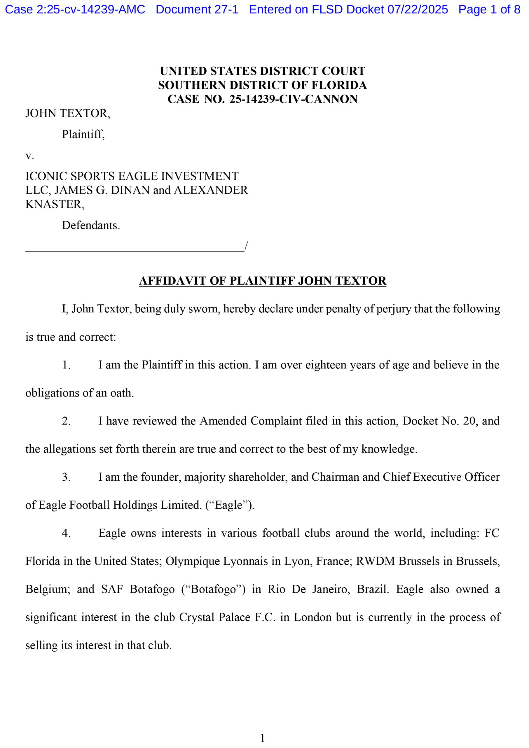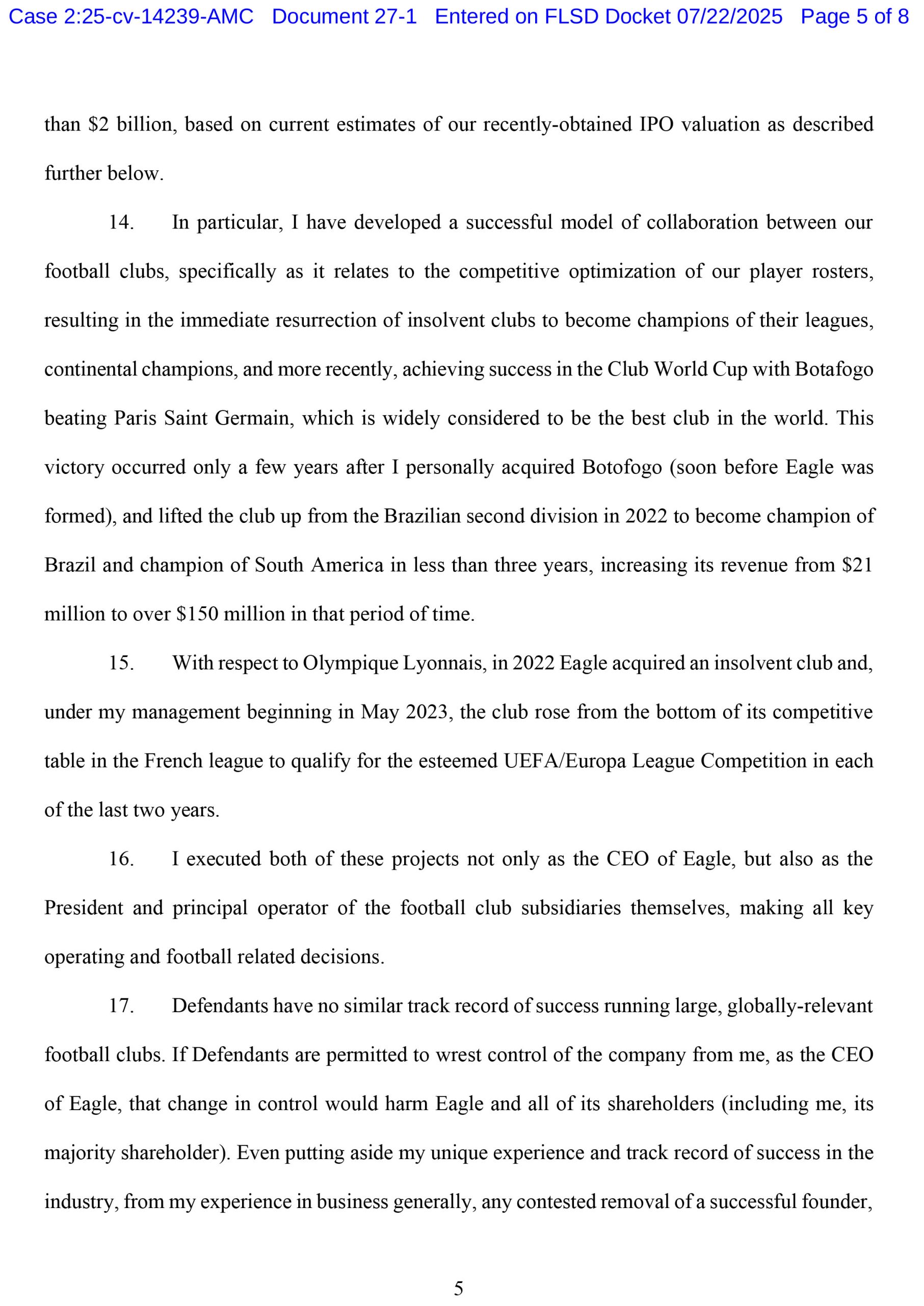 Caso o Conselho tivesse concordado com a Iconic, Textor perderia o controle da Eagle. Só que, em abril, o empresário norte-americano havia entrado com uma ação na Justiça da Flórida, buscando impedir que a Iconic tomasse o poder. E a decisão, liminar, saiu.