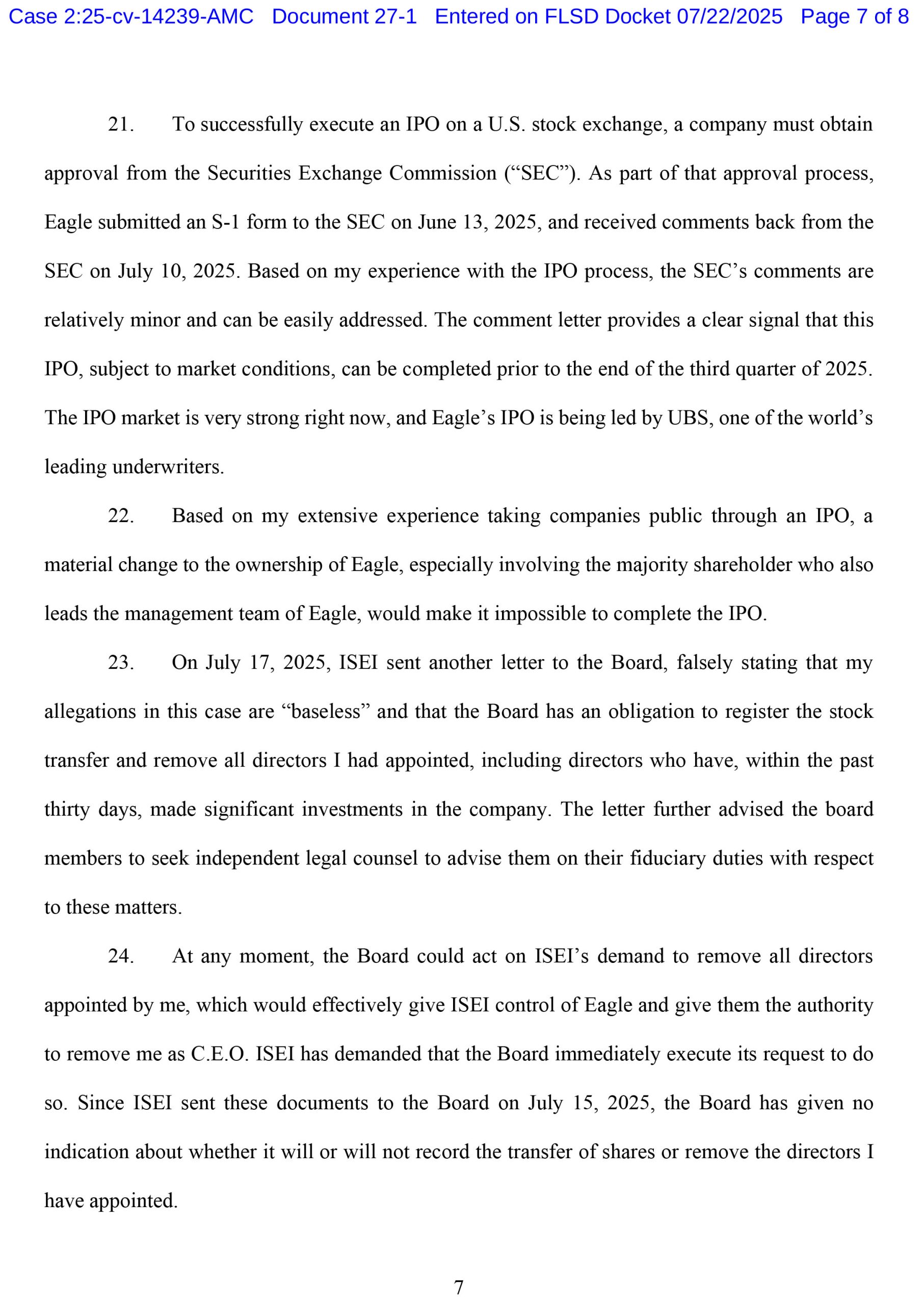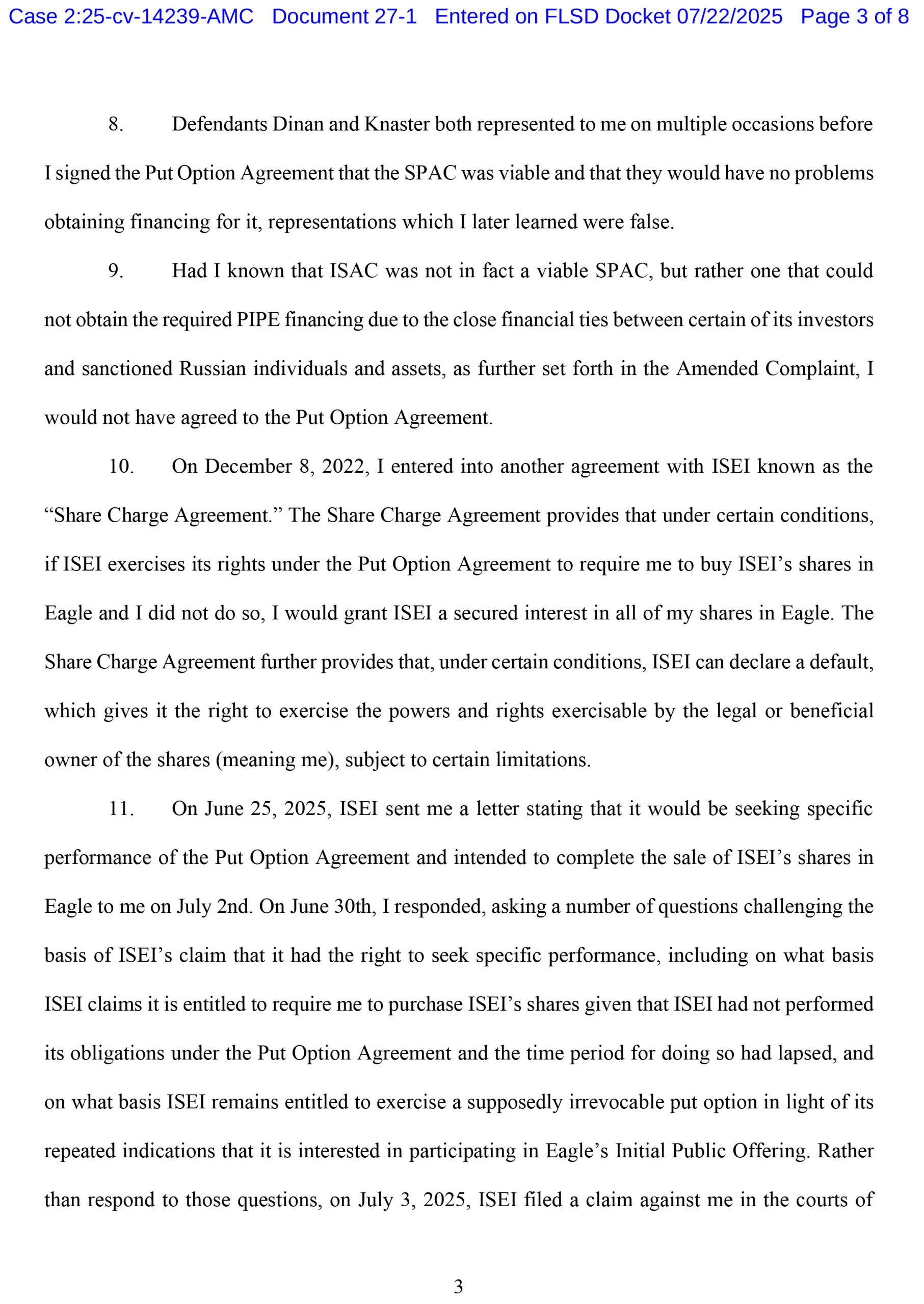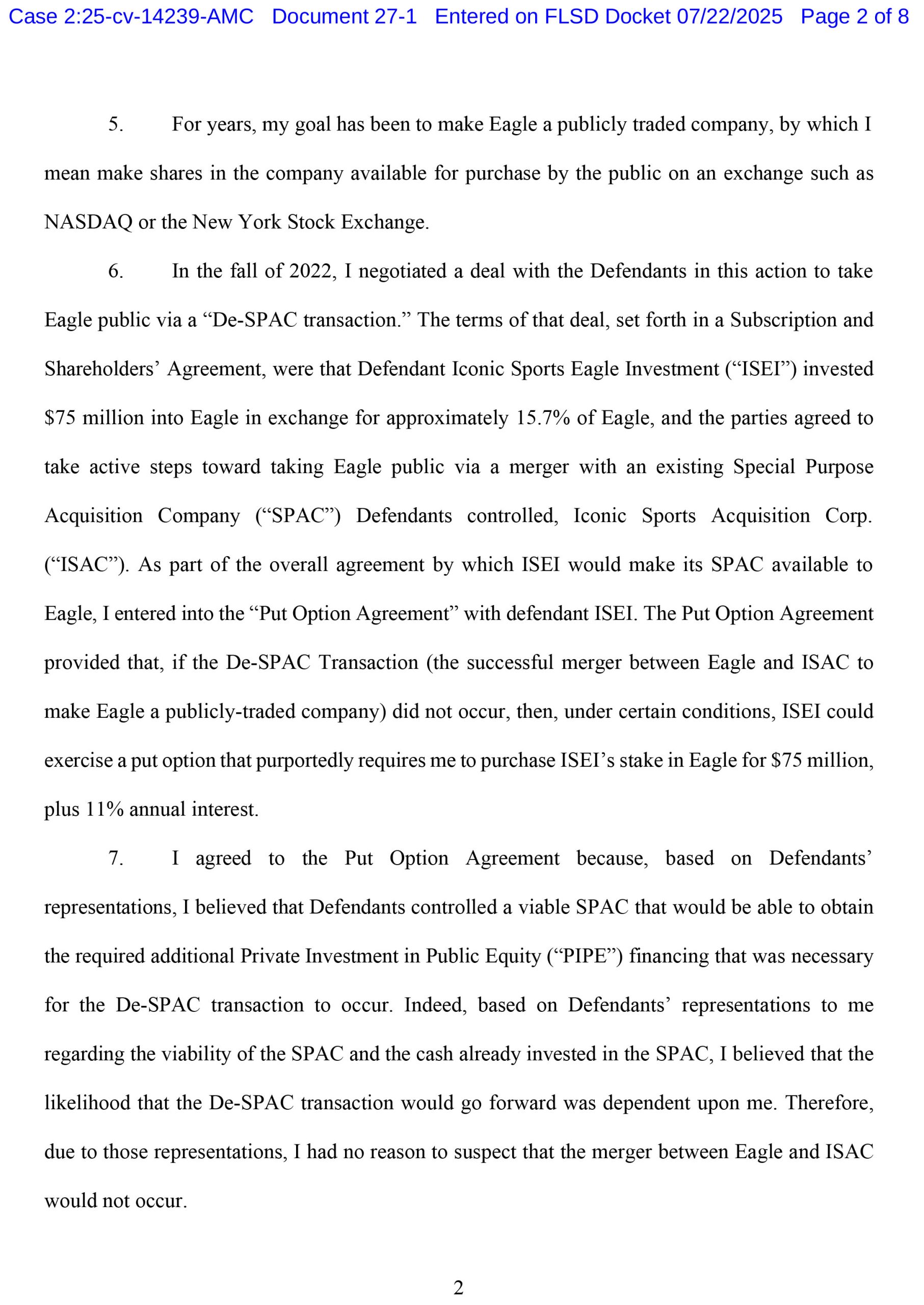 Um dos argumentos usados por Textor, e aceitos pela justiça, é de que a Iconic não conseguiria ter sucesso em transformar a Eagle numa Spac devido ao sócios da empresa terem ligações com empresários russos, que estão proibidos de fazer negócios nos Estados Unidos devido à guerra na Ucrânia.