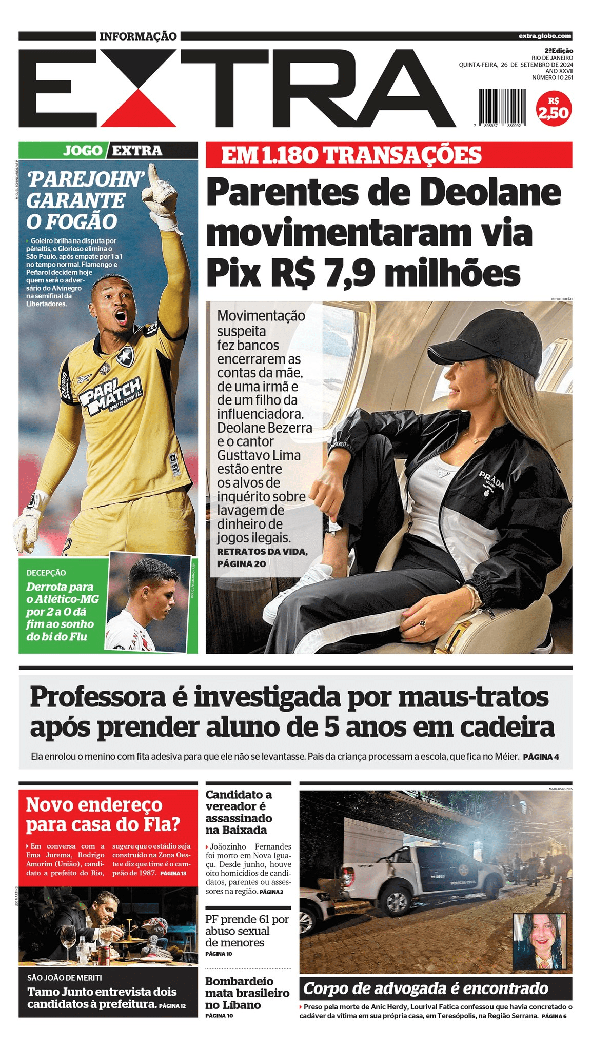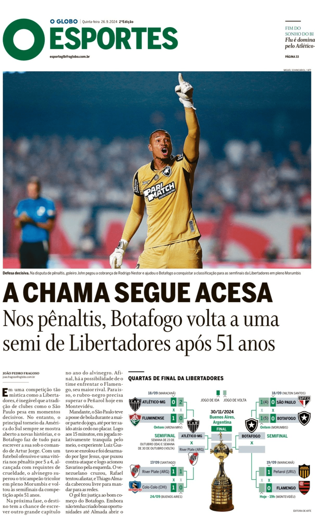O jornal “Extra” destacou uma foto do goleiro John, herói da classificação ao defender o pênalti de Rodrigo Nestor: “PareJohn garante o Fogão“. A imagem contrasta com a tristeza de Thiago Silva, que viu o Fluminense ser eliminado pelo Atlético-MG com dois gols de Deyverson em Belo Horizonte.