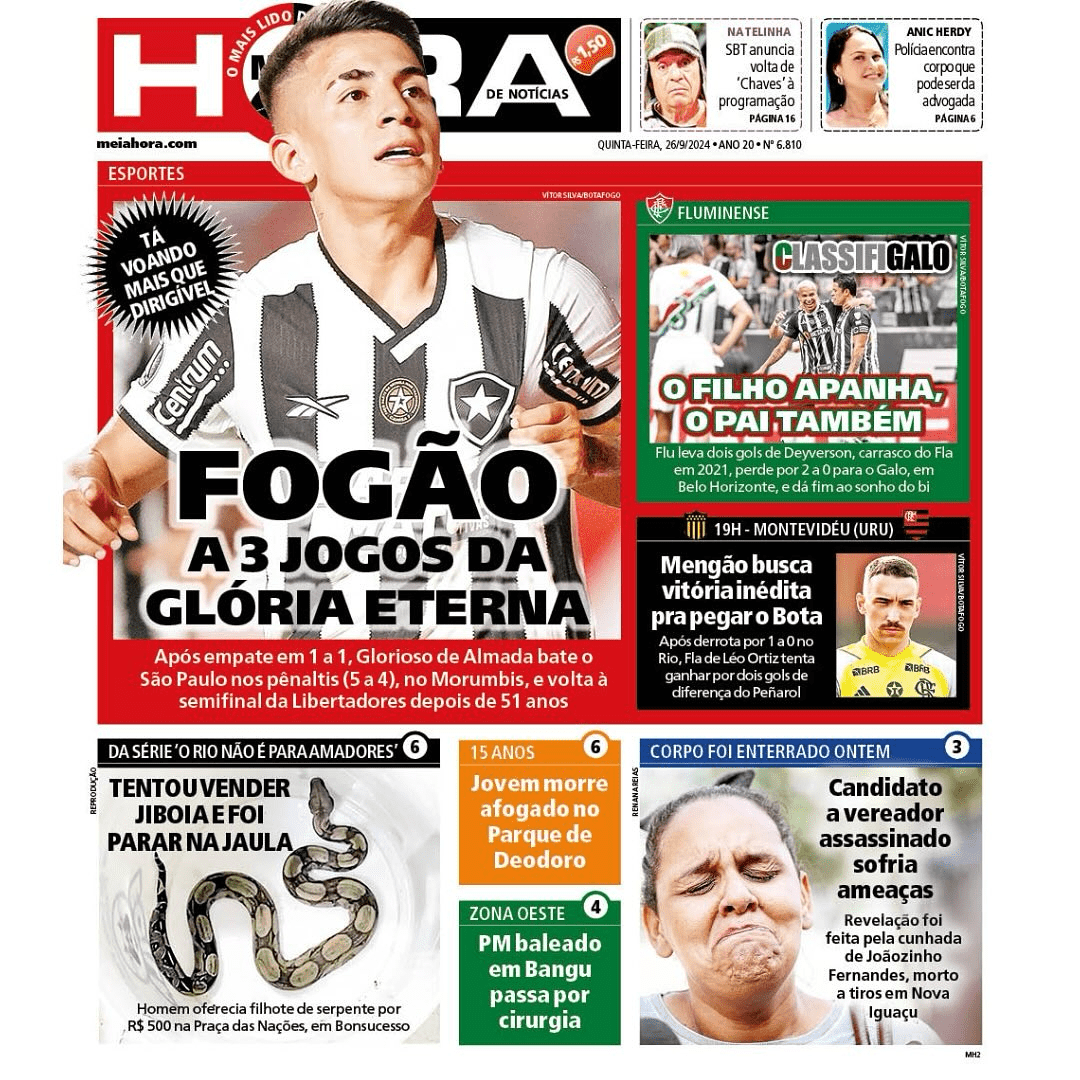 O “Meia Hora” foi quem chamou a classificação alvinegra com mais destaque. Estampou uma foto de Thiago Almada, manchetou “Fogão a 3 jogos da glória eterna” e ainda deu uma zoada no zepelim do São Paulo que caiu ontem à tarde em Osasco: “Tá voando mais que dirigível”.