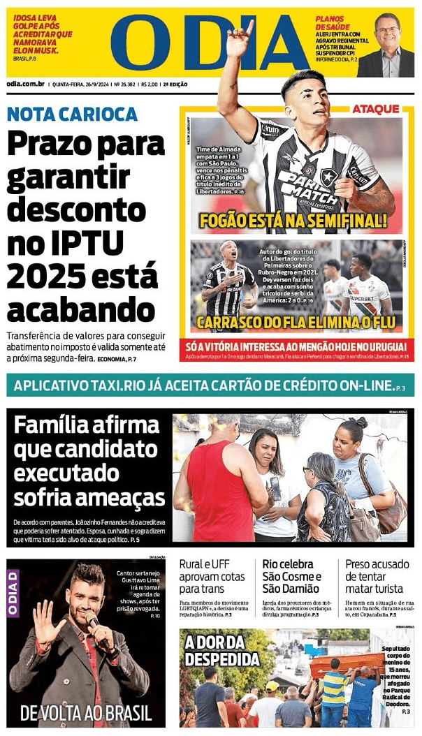 Os jornais do Rio de Janeiro destacaram nesta quinta-feira (26/9) a classificação do Botafogo para as semifinais da Libertadores, com vitória sobre o São Paulo nos pênaltis, no Morumbis, após empate em 1 a 1 no tempo normal.