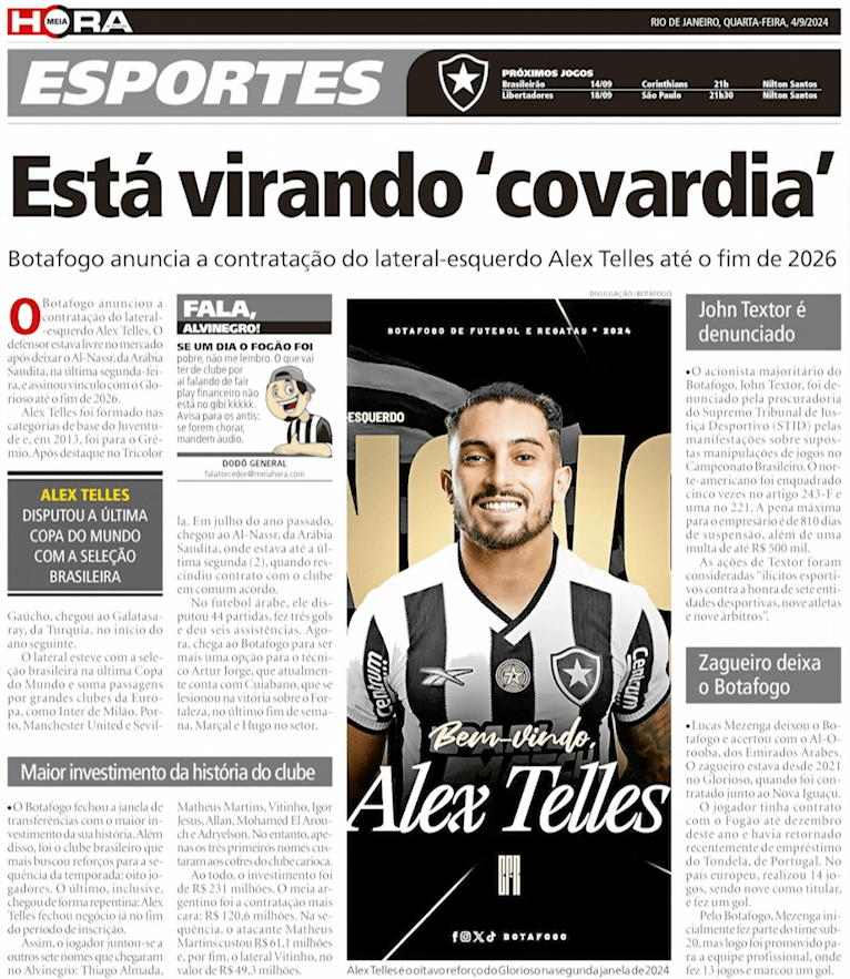 Os movimentos do Botafogo no mercado estão chamando muito a atenção. Nesta quarta-feira, o jornal “Meia Hora” destacou a contratação de Alex Telles, e não economizou na manchete: “Está virando covardia”.