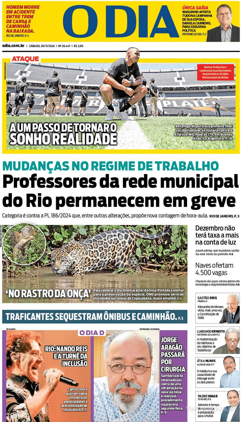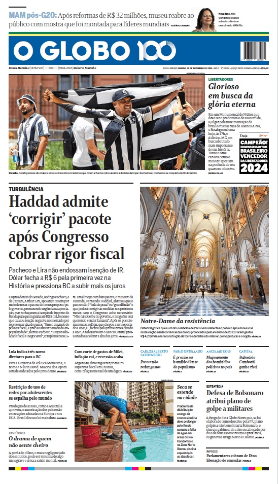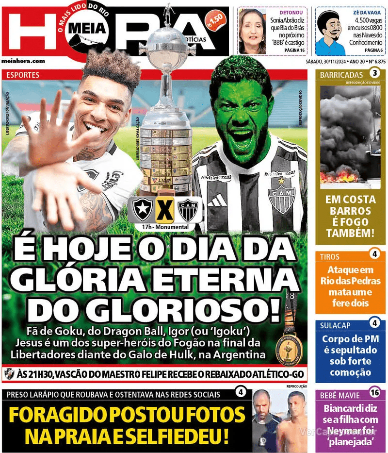 “Vamos, Botafogo!”, foi a manchete do jornal, que destacou abaixo: “Chegou o dia de todas as gerações de estrelas alvinegras brilharem juntas: a batalha pela primeira Libertadores da história do clube começa às 17h”.