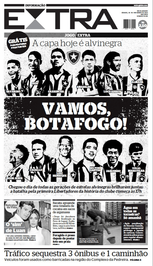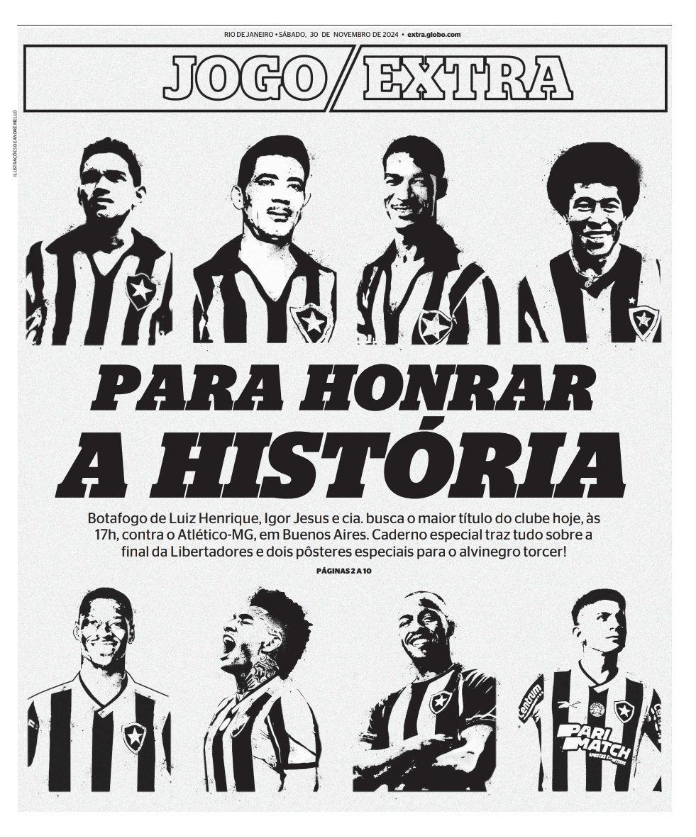 Chegou o dia! E o jornal “Extra” trouxe neste sábado uma capa totalmente em preto e branco, com ídolos do Botafogo misturados aos jogadores do atual elenco para destacar a final da Libertadores.