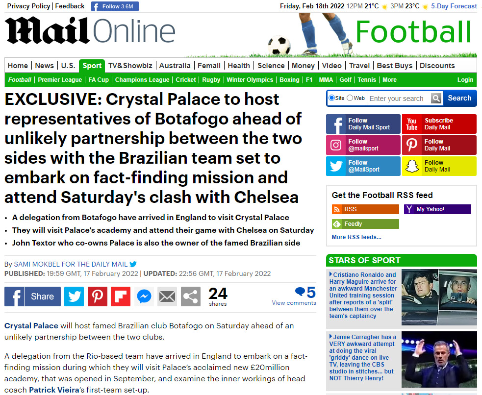 A reportagem, assinada pelo jornalista Sami Mokbel, destaca a “improvável parceria” entre Botafogo e Crystal Palace. O clube inglês tem como um dos donos o americano John Textor, que está adquirindo 90% da SAF do Glorioso por R$ 400 milhões.