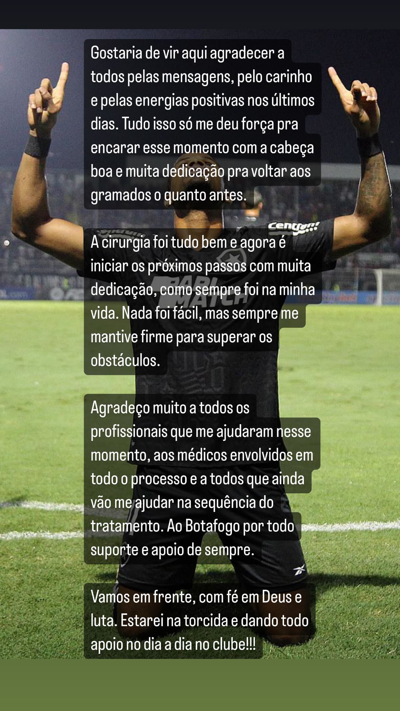 Agradeço muito a todos os profissionais que me ajudaram nesse momento, aos médicos envolvidos em todo o processo e a todos que ainda não me ajudar na sequência do tratamento. Ao Botafogo, por todo suporte e apoio de sempre.
