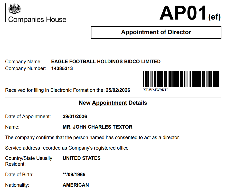 Além de John Textor, também foi nomeado como diretor da Eagle Bidco o britânico Robin James Mostyn Pugh. Os dois são, no momento, segundo o site da Companies House, os únicos diretores da empresa.